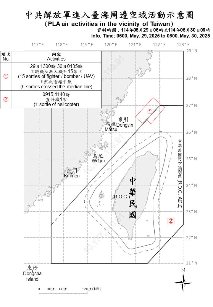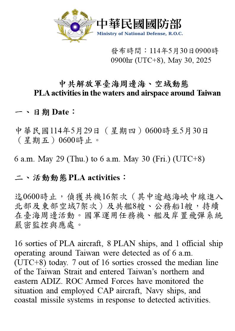 16 sorties of PLA aircraft, 8 PLAN ships, and 1 official ship operating around Taiwan were detected as of 6 a.m. (UTC+8) today. 7 out of 16 sorties crossed the median line of the Taiwan Strait and entered Taiwan’s northern and eastern ADIZ. ROC Armed Forces have monitored the situation and employed CAP aircraft, Navy ships, and coastal missile systems in response to detected activities.