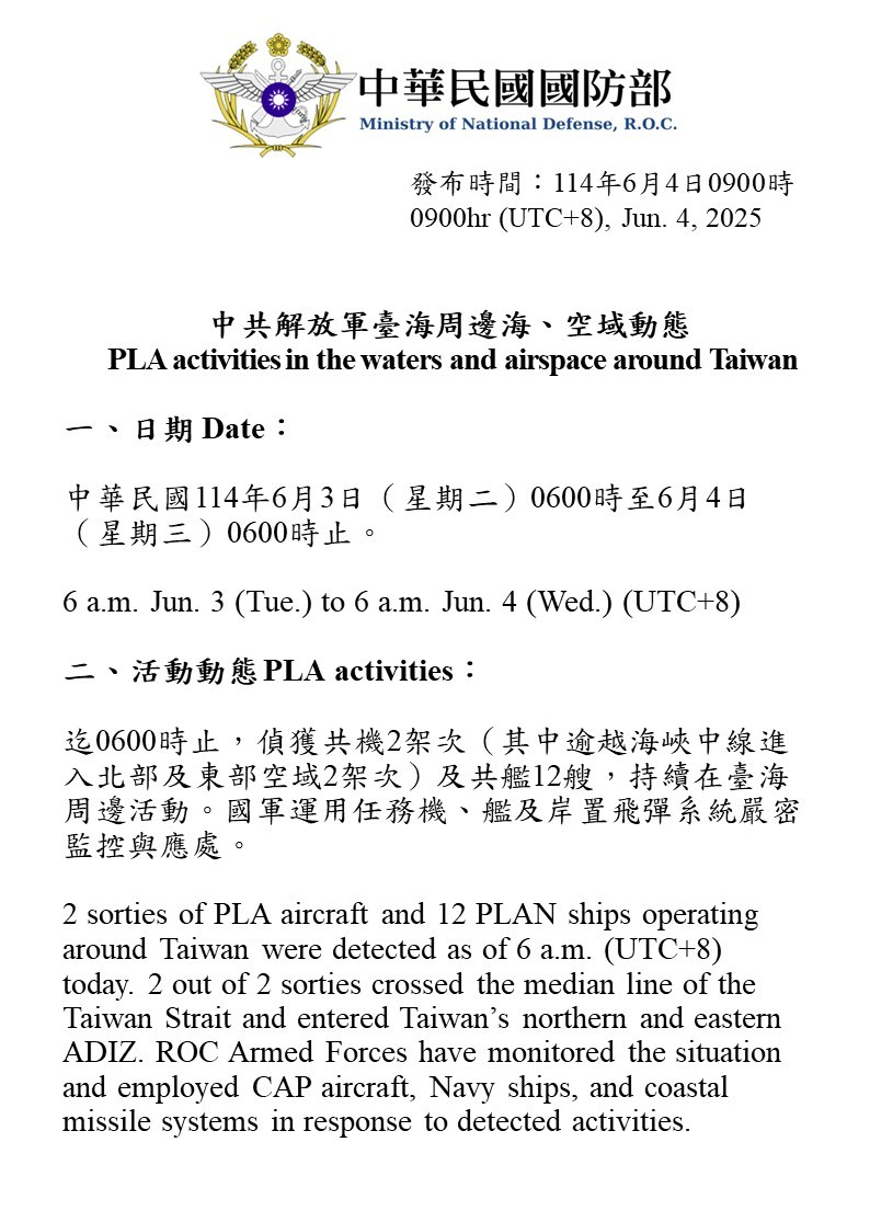 2 sorties of PLA aircraft and 12 PLAN ships operating around Taiwan were detected as of 6 a.m. (UTC+8) today. 2 out of 2 sorties crossed the median line of the Taiwan Strait and entered Taiwan’s northern and eastern ADIZ. ROC Armed Forces have monitored the situation and employed CAP aircraft, Navy ships, and coastal missile systems in response to detected activities.