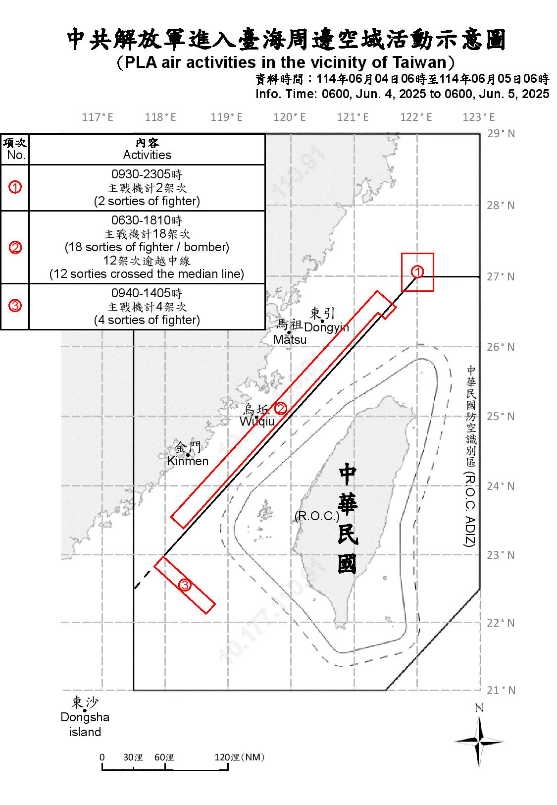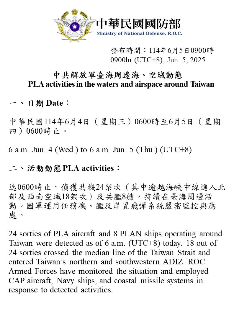 24 sorties of PLA aircraft and 8 PLAN ships operating around Taiwan were detected as of 6 a.m. (UTC+8) today. 18 out of 24 sorties crossed the median line of the Taiwan Strait and entered Taiwan’s northern and eastern ADIZ. ROC Armed Forces have monitored the situation and employed CAP aircraft, Navy ships, and coastal missile systems in response to detected activities.