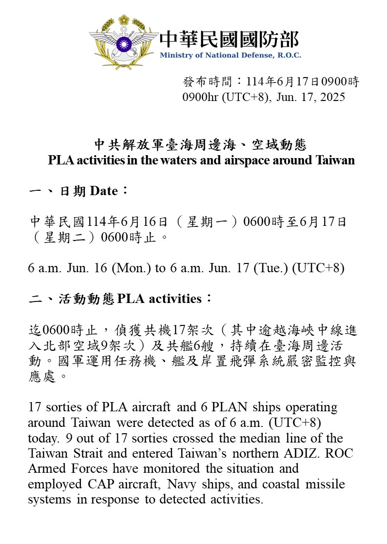 17 sorties of PLA aircraft and 6 PLAN ships operating around Taiwan were detected as of 6 a.m. (UTC+8) today. 9 out of 17 sorties crossed the median line of the Taiwan Strait and entered Taiwan’s northern ADIZ. ROC Armed Forces have monitored the situation and employed CAP aircraft, Navy ships, and coastal missile systems in response to detected activities.