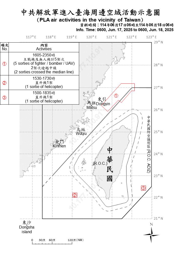 7 sorties of PLA aircraft and 6 PLAN ships operating around Taiwan were detected as of 6 a.m. (UTC+8) today. 4 out of 7 sorties crossed the median line of the Taiwan Strait and entered Taiwan’s northern, southwestern and eastern ADIZ. ROC Armed Forces have monitored the situation and employed CAP aircraft, Navy ships, and coastal missile systems in response to detected activities.