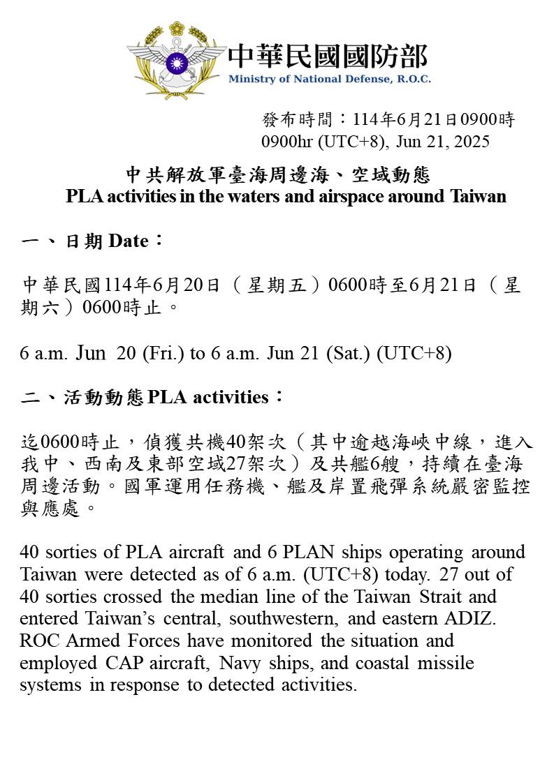 40 sorties of PLA aircraft and 6 PLAN ships operating around Taiwan were detected as of 6 a.m. (UTC+8) today. 27 out of 40 sorties crossed the median line of the Taiwan Strait and entered Taiwan’s central, southwestern, and eastern ADIZ. ROC Armed Forces have monitored the situation and employed CAP aircraft, Navy ships, and coastal missile systems in response to detected activities.