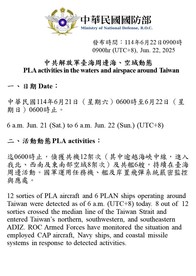 12 sorties of PLA aircraft and 6 PLAN ships operating around Taiwan were detected as of 6 a.m. (UTC+8) today. 8 out of 12 sorties crossed the median line of the Taiwan Strait and entered Taiwan’s northern, southwestern, and southeastern ADIZ. ROC Armed Forces have monitored the situation and employed CAP aircraft, Navy ships, and coastal missile systems in response to detected activities.