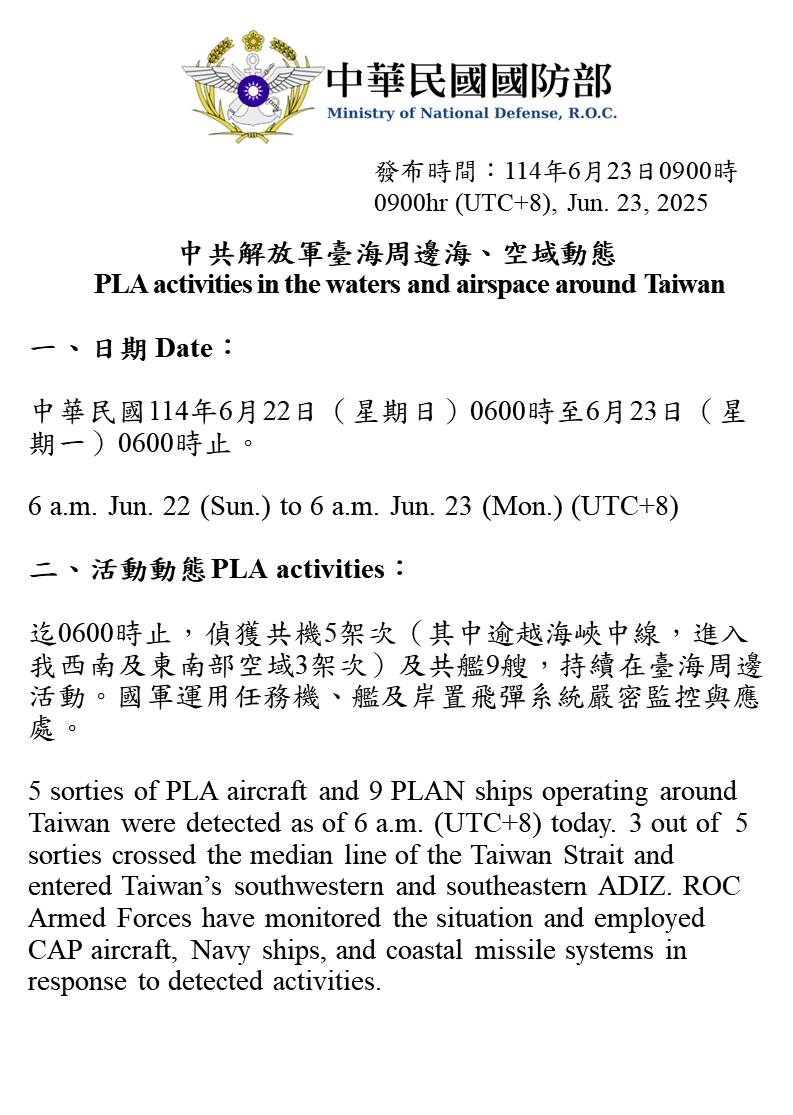 5 sorties of PLA aircraft and 9 PLAN ships operating around Taiwan were detected as of 6 a.m. (UTC+8) today. 3 out of 5 sorties crossed the median line of the Taiwan Strait and entered Taiwan’s southwestern and southeastern ADIZ. ROC Armed Forces have monitored the situation and employed CAP aircraft, Navy ships, and coastal missile systems in response to detected activities.