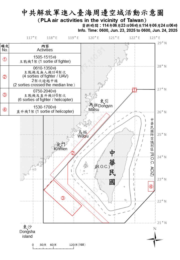 12 sorties of PLA aircraft and 7 PLAN ships operating around Taiwan were detected as of 6 a.m. (UTC+8) today. 10 out of 12 sorties crossed the median line of the Taiwan Strait and entered Taiwan’s northern, southwestern, and southeastern ADIZ. ROC Armed Forces have monitored the situation and employed CAP aircraft, Navy ships, and coastal missile systems in response to detected activities.