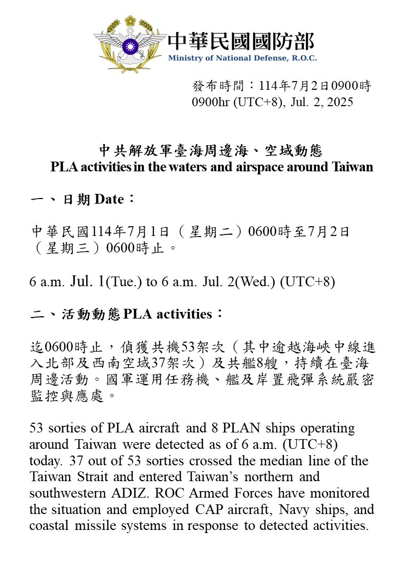 53 sorties of PLA aircraft and 8 PLAN ships operating around Taiwan were detected as of 6 a.m. (UTC+8) today. 37 out of 53 sorties crossed the median line of the Taiwan Strait and entered Taiwan’s northern and southwestern ADIZ. ROC Armed Forces have monitored the situation and employed CAP aircraft, Navy ships, and coastal missile systems in response to detected activities.