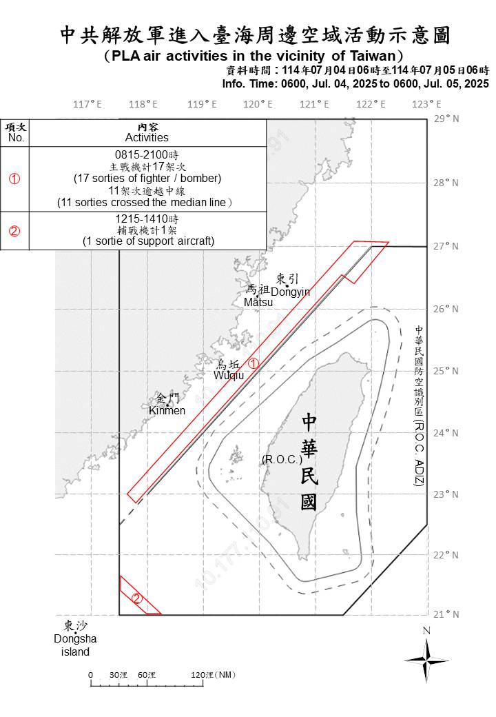 18 sorties of PLA aircraft, 11 PLAN ships, and 1 official ship operating around Taiwan were detected as of 6 a.m. (UTC+8) today. 12 out of 18 sorties crossed the median line of the Taiwan Strait and entered Taiwan’s northern and southwestern ADIZ. ROC Armed Forces have monitored the situation and employed CAP aircraft, Navy ships, and coastal missile systems in response to detected activities.