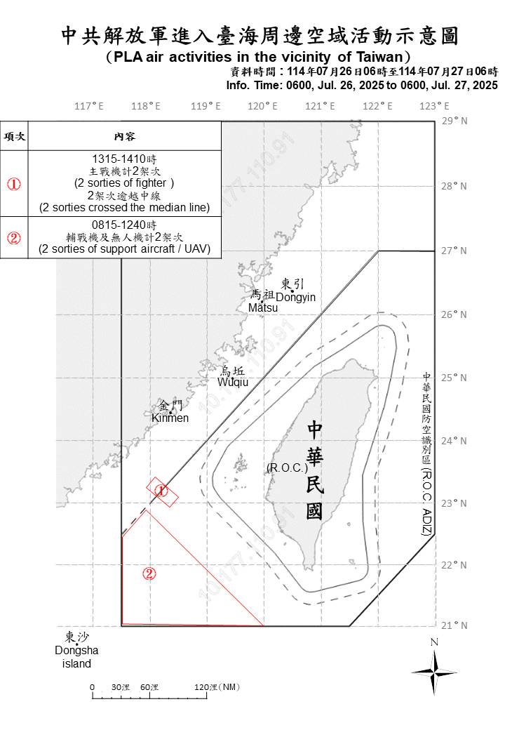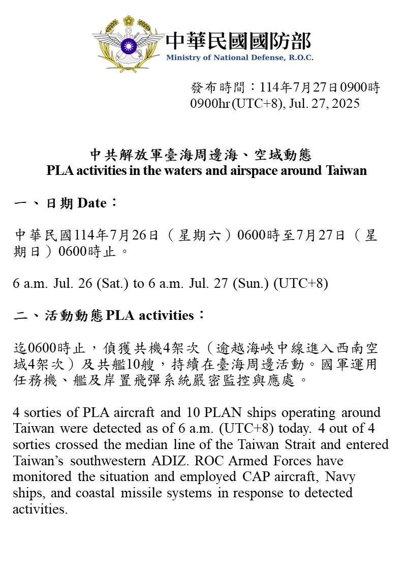 4 sorties of PLA aircraft and 10 PLAN ships operating around Taiwan were detected as of 6 a.m. (UTC+8) today. 4 out of 4 sorties crossed the median line of the Taiwan Strait and entered Taiwan’s southwestern ADIZ. ROC Armed Forces have monitored the situation and employed CAP aircraft, Navy ships, and coastal missile systems in response to detected activities.