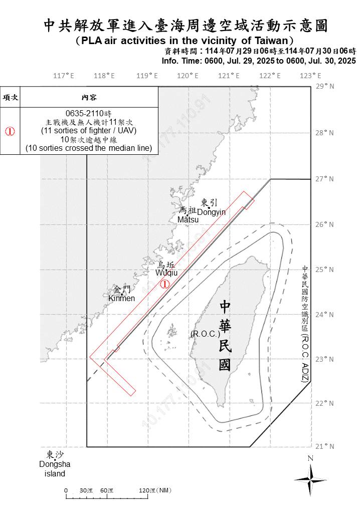 11 sorties of PLA aircraft, 6 PLAN ships operating around Taiwan were detected as of 6 a.m. (UTC+8) today. 10 out of 11 sorties crossed the median line of the Taiwan Strait and entered Taiwan’s northern and southwestern ADIZ. ROC Armed Forces have monitored the situation and employed CAP aircraft, Navy ships, and coastal missile systems in response to detected activities.