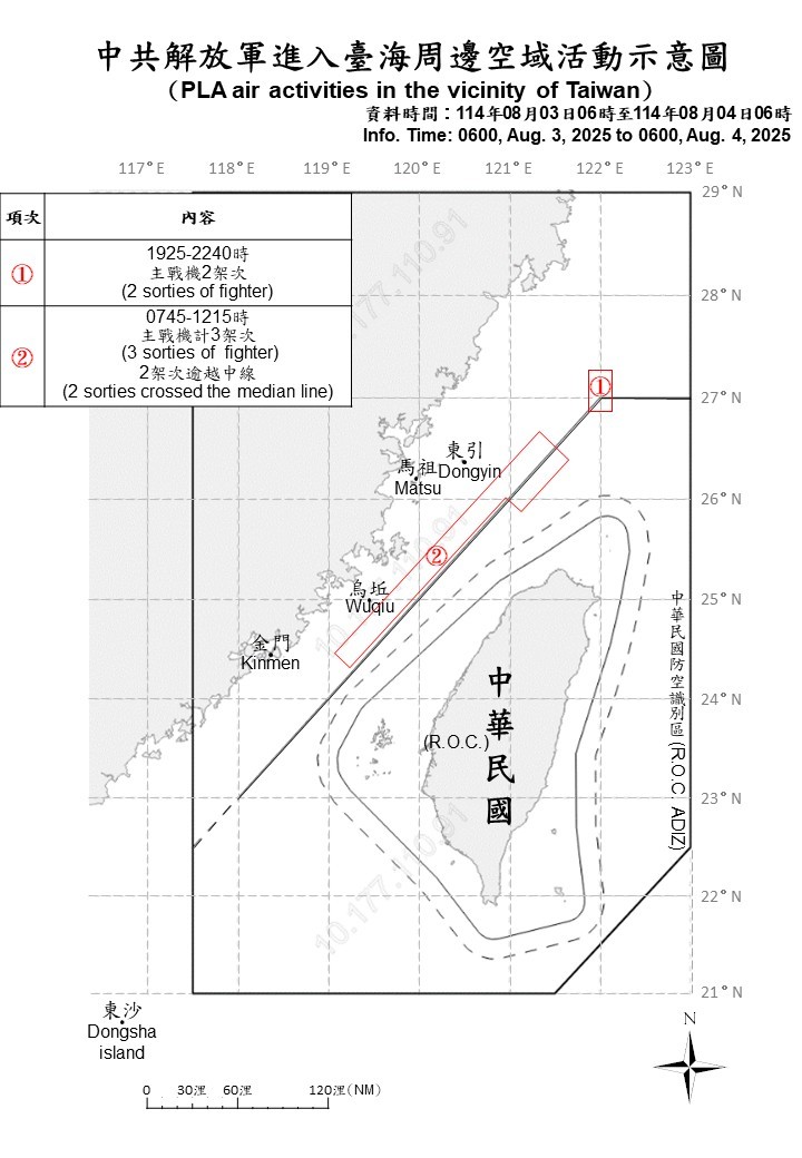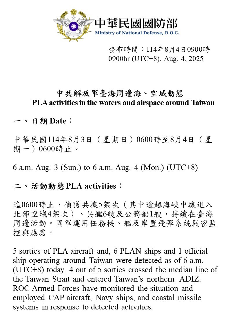 5 sorties of PLA aircraft and, 6 PLAN ships and 1 official ship operating around Taiwan were detected as of 6 a.m. (UTC+8) today. 4 out of 5 sorties crossed the median line of the Taiwan Strait and entered Taiwan’s northern  ADIZ. ROC Armed Forces have monitored the situation and employed CAP aircraft, Navy ships, and coastal missile systems in response to detected activities.