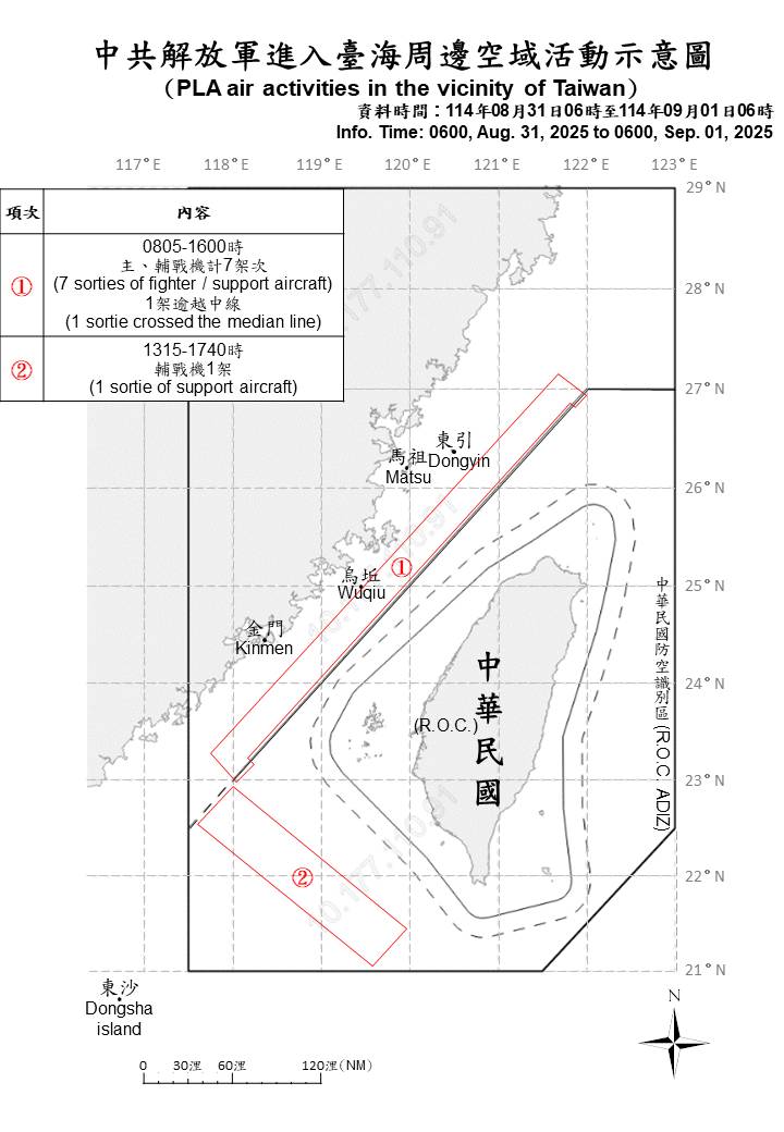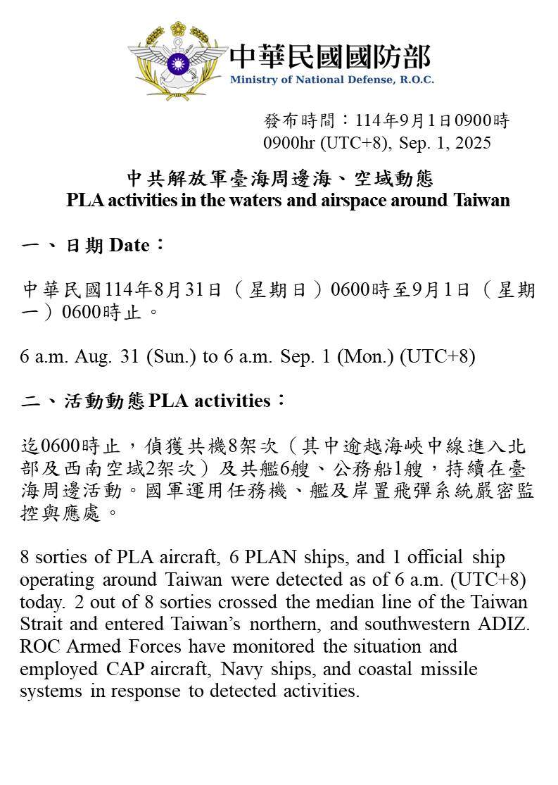 8 sorties of PLA aircraft, 6 PLAN ships, and 1 official ship operating around Taiwan were detected as of 6 a.m. (UTC+8) today. 2 out of 8 sorties crossed the median line of the Taiwan Strait and entered Taiwan’s northern, and southwestern ADIZ. ROC Armed Forces have monitored the situation and employed CAP aircraft, Navy ships, and coastal missile systems in response to detected activities.