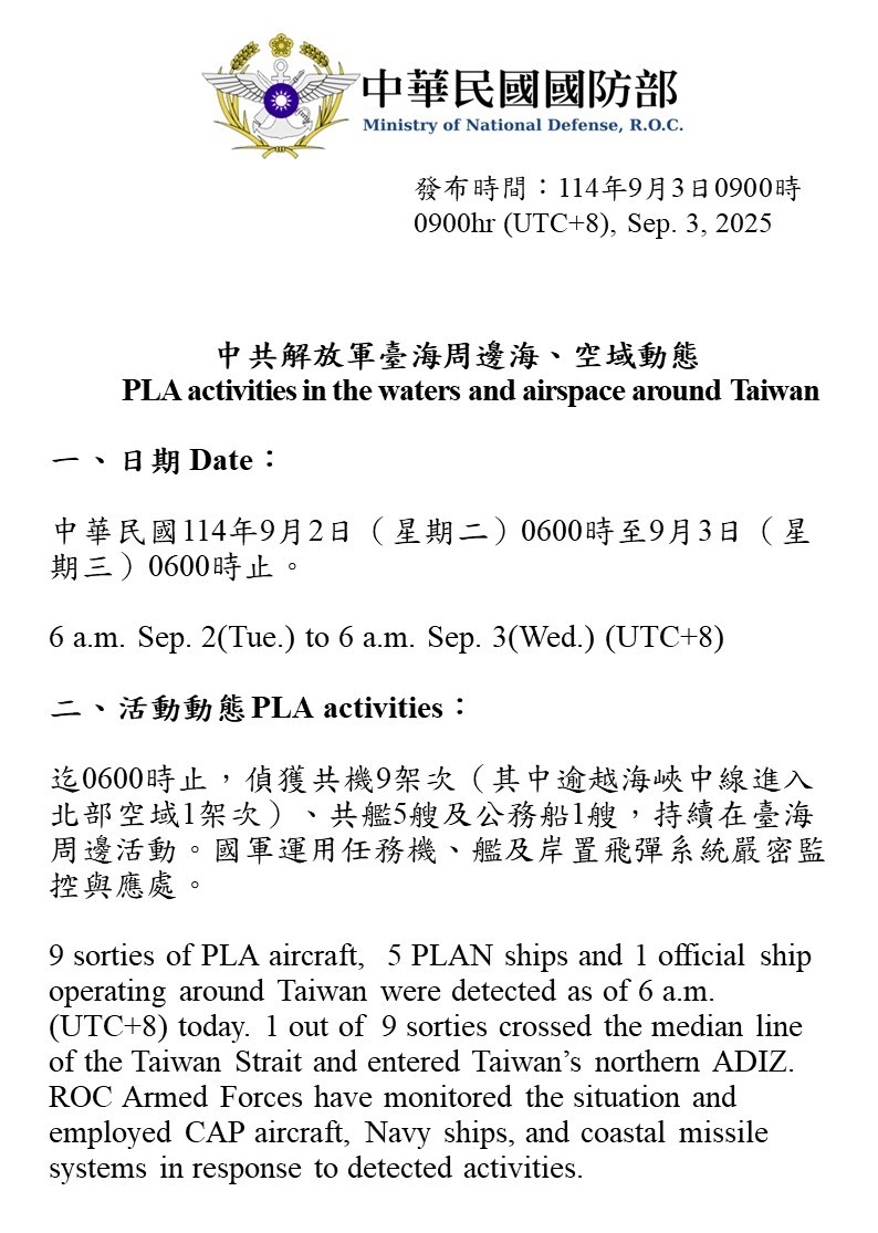 9 sorties of PLA aircraft,  5 PLAN ships and 1 official ship operating around Taiwan were detected as of 6 a.m. (UTC+8) today. 1 out of  9 sorties crossed the median line of the Taiwan Strait and entered Taiwan’s northern ADIZ. ROC Armed Forces have monitored the situation and employed CAP aircraft, Navy ships, and coastal missile systems in response to detected activities.