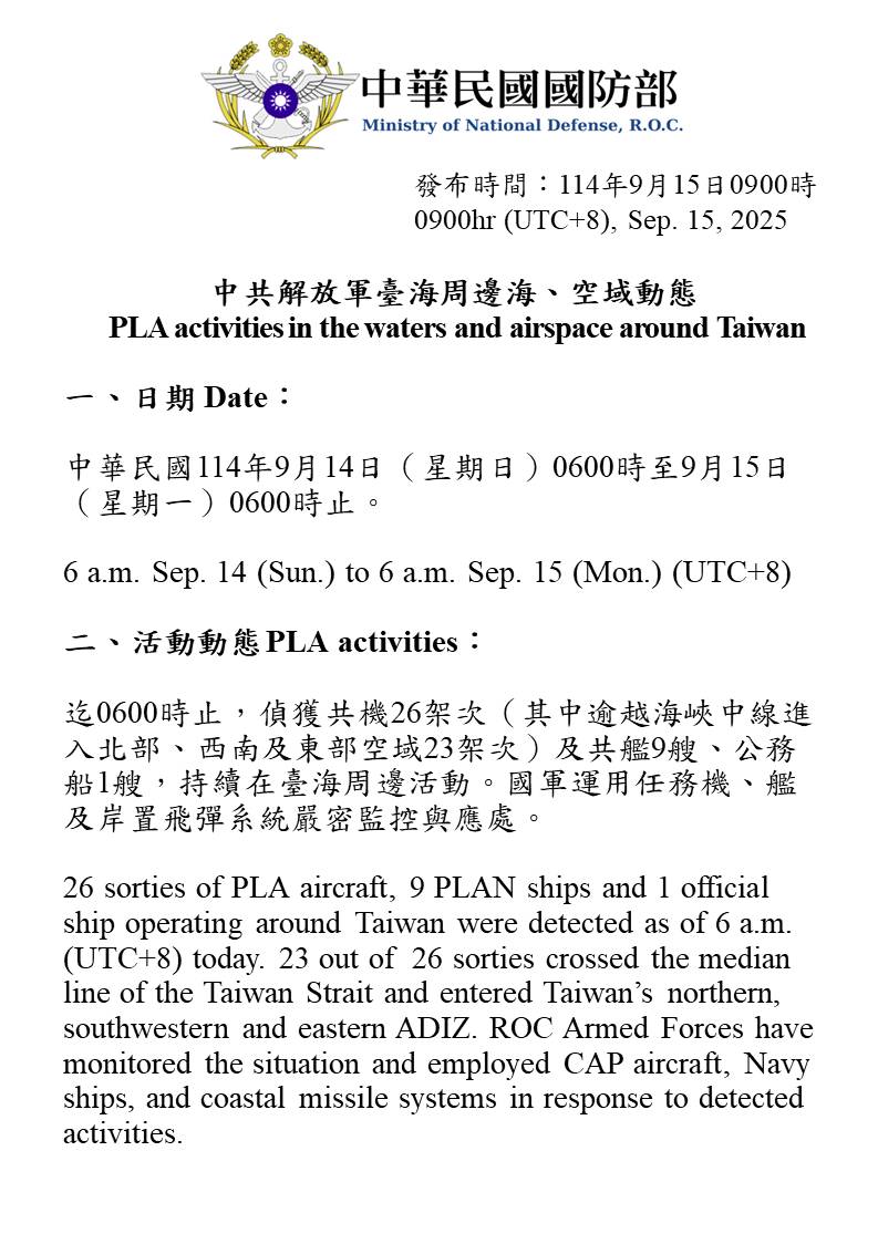 26 sorties of PLA aircraft, 9 PLAN ships and 1 official ship operating around Taiwan were detected as of 6 a.m. (UTC+8) today. 23 out of  26 sorties crossed the median line of the Taiwan Strait and entered Taiwan’s northern, southwestern and eastern ADIZ. ROC Armed Forces have monitored the situation and employed CAP aircraft, Navy ships, and coastal missile systems in response to detected activities.
