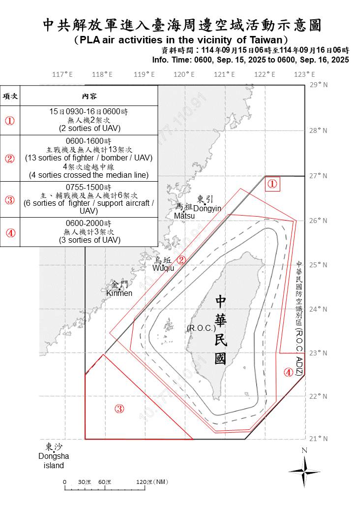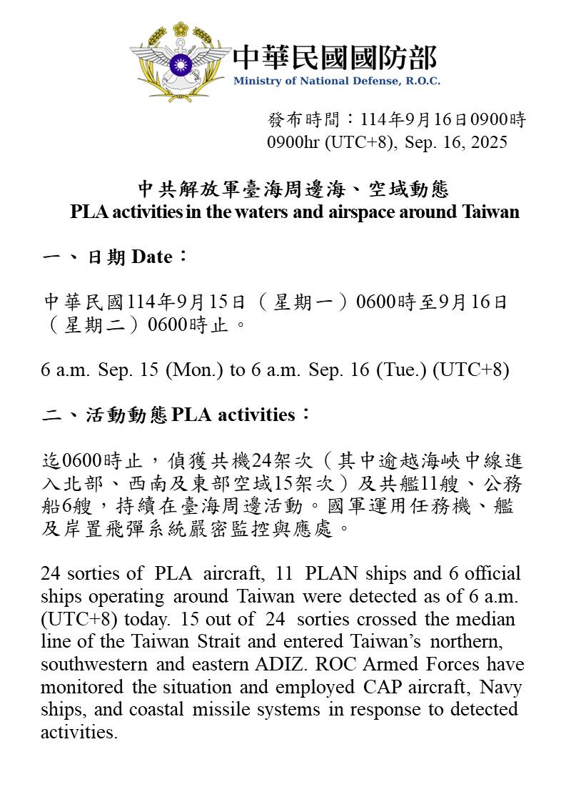 24 sorties of PLA aircraft, 11 PLAN ships and 6 official ships operating around Taiwan were detected as of 6 a.m. (UTC+8) today. 15 out of 24 sorties crossed the median line of the Taiwan Strait and entered Taiwan’s northern, southwestern and eastern ADIZ. ROC Armed Forces have monitored the situation and employed CAP aircraft, Navy ships, and coastal missile systems in response to detected activities.