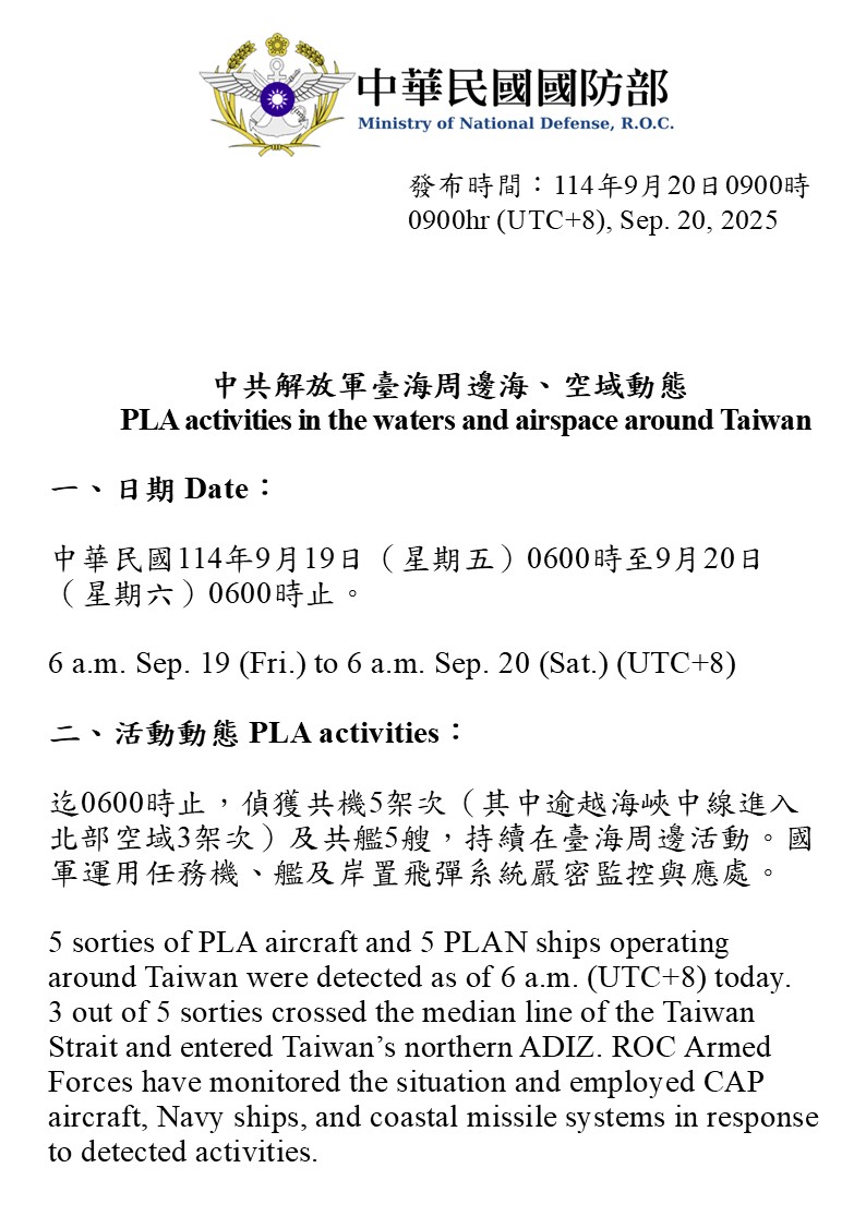 5 sorties of PLA aircraft and 5 PLAN ships operating around Taiwan were detected as of 6 a.m. (UTC+8) today. 3 out of 5 sorties crossed the median line of the Taiwan Strait and entered Taiwan’s northern ADIZ. ROC Armed Forces have monitored the situation and employed CAP aircraft, Navy ships, and coastal missile systems in response to detected activities.