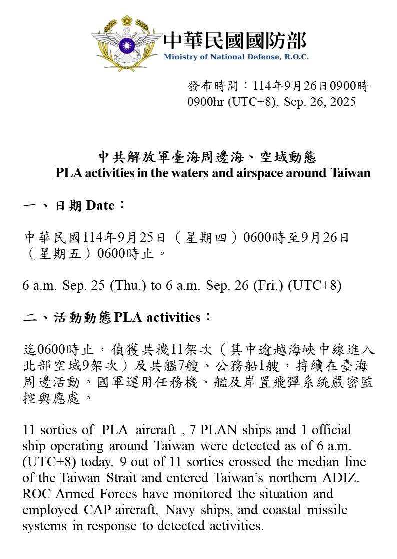 11 sorties of PLA aircraft , 7 PLAN ships and 1 official ship operating around Taiwan were detected as of 6 a.m. (UTC+8) today. 9 out of 11 sorties crossed the median line of the Taiwan Strait and entered Taiwan’s northern ADIZ. ROC Armed Forces have monitored the situation and employed CAP aircraft, Navy ships, and coastal missile systems in response to detected activities.