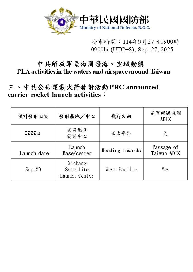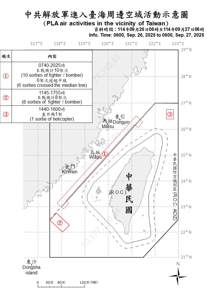 19 sorties of PLA aircraft, 7 PLAN ships, and 2 official ship operating around Taiwan were detected as of 6 a.m. (UTC+8) today. 15 out of 19 sorties crossed the median line of the Taiwan Strait and entered Taiwan’s northern, central and southwestern ADIZ. ROC Armed Forces have monitored the situation and employed CAP aircraft, Navy ships, and coastal missile systems in response to detected activities.