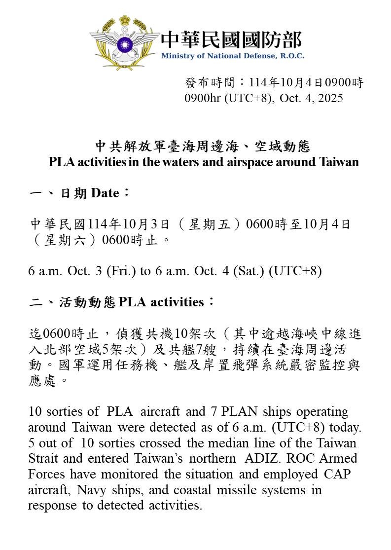 10 sorties of PLA aircraft and 7 PLAN ships operating around Taiwan were detected as of 6 a.m. (UTC+8) today. 5 out of 10 sorties crossed the median line of the Taiwan Strait and entered Taiwan’s northern ADIZ. ROC Armed Forces have monitored the situation and employed CAP aircraft, Navy ships, and coastal missile systems in response to detected activities.