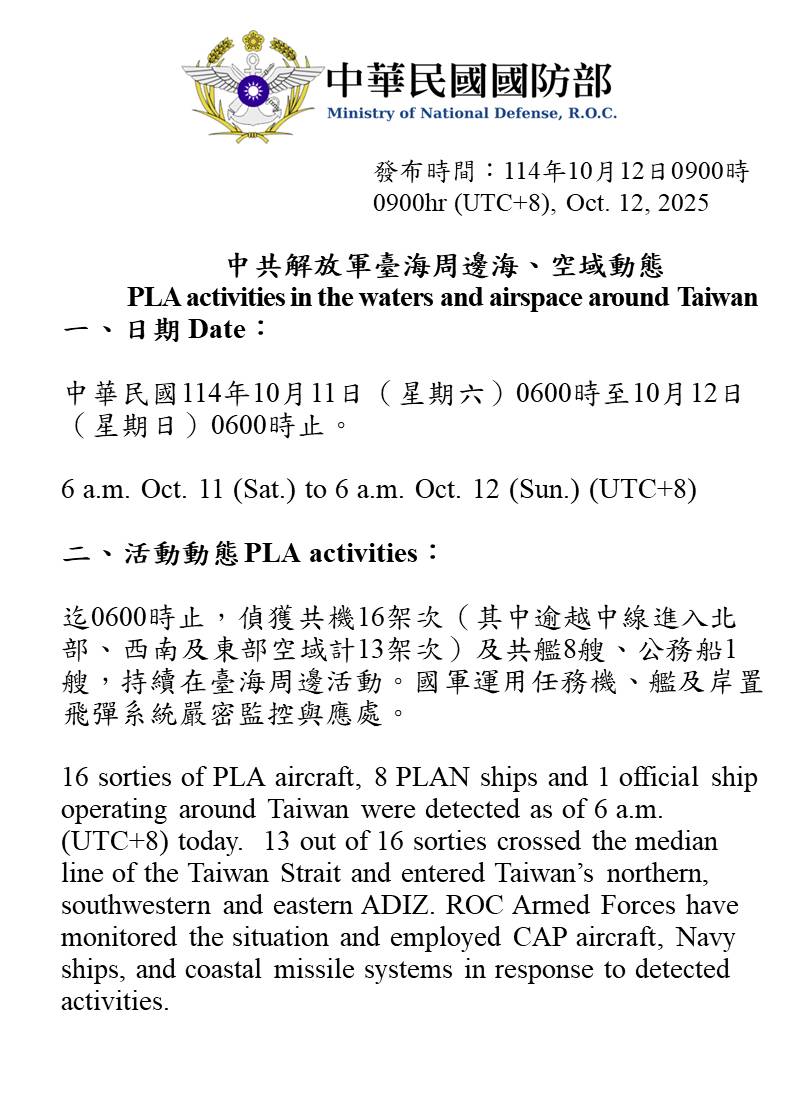 16 sorties of PLA aircraft, 8 PLAN ships and 1 official ship operating around Taiwan were detected as of 6 a.m. (UTC+8) today.  13 out of 16 sorties crossed the median line of the Taiwan Strait and entered Taiwan’s northern, southwestern and eastern ADIZ. ROC Armed Forces have monitored the situation and employed CAP aircraft, Navy ships, and coastal missile systems in response to detected activities.