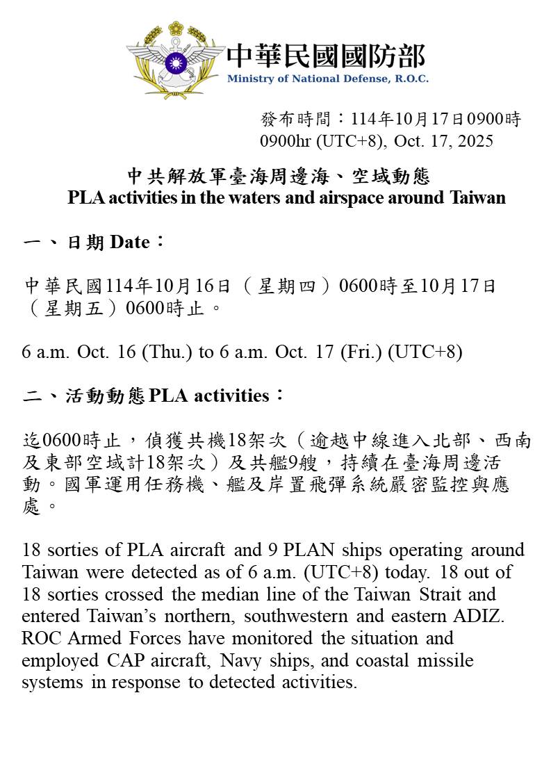 18 sorties of PLA aircraft and 9 PLAN ships operating around Taiwan were detected as of 6 a.m. (UTC+8) today. 18 out of 18 sorties crossed the median line of the Taiwan Strait and entered Taiwan’s northern, southwestern and eastern ADIZ. ROC Armed Forces have monitored the situation and employed CAP aircraft, Navy ships, and coastal missile systems in response to detected activities.