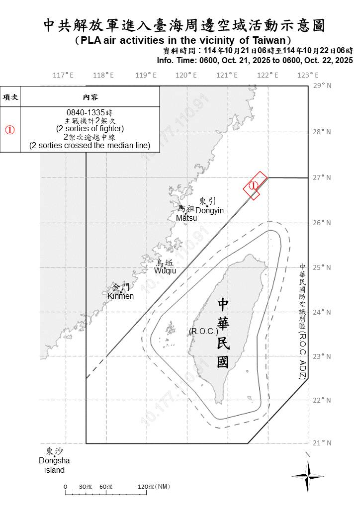 2 sorties of PLA aircraft, 4 PLAN ships and 1 official ship operating around Taiwan were detected as of 6 a.m. (UTC+8) today. 2 out of 2 sorties crossed the median line of the Taiwan Strait and entered Taiwan’s northern ADIZ. ROC Armed Forces have monitored the situation and employed CAP aircraft, Navy ships, and coastal missile systems in response to detected activities.