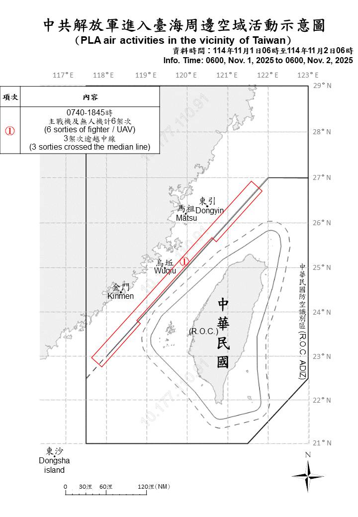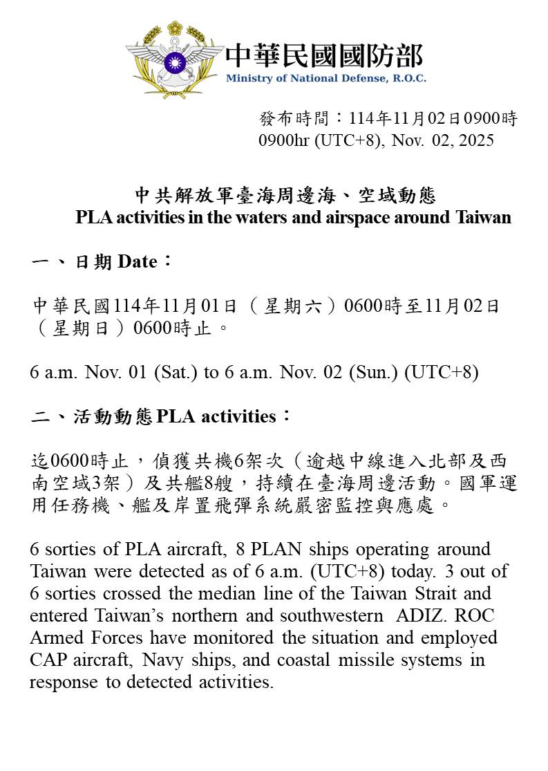 6 sorties of PLA aircraft, 8 PLAN ships operating around Taiwan were detected as of 6 a.m. (UTC+8) today. 3 out of 6 sorties crossed the median line of the Taiwan Strait and entered Taiwan’s northern and southwestern ADIZ. ROC Armed Forces have monitored the situation and employed CAP aircraft, Navy ships, and coastal missile systems in response to detected activities.