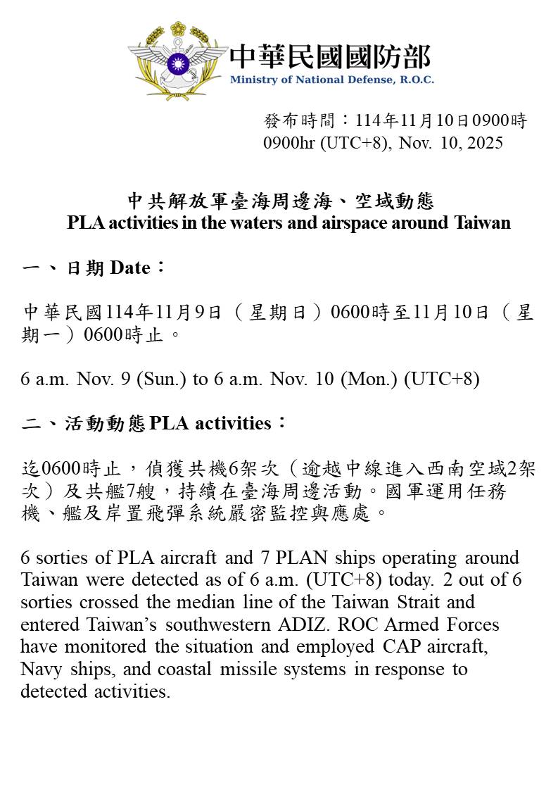 6 sorties of PLA aircraft and 7 PLAN ships operating around Taiwan were detected as of 6 a.m. (UTC+8) today. 2 out of 6 sorties crossed the median line of the Taiwan Strait and entered Taiwan’s central ADIZ. ROC Armed Forces have monitored the situation and employed CAP aircraft, Navy ships, and coastal missile systems in response to detected activities.