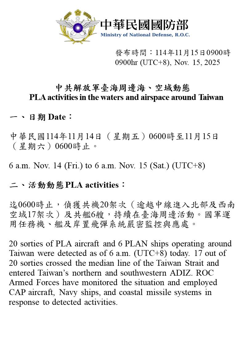 20 sorties of PLA aircraft and 6 PLAN ships operating around Taiwan were detected as of 6 a.m. (UTC+8) today. 17 out of 20 sorties crossed the median line of the Taiwan Strait and entered Taiwan’s northern and southwestern ADIZ. ROC Armed Forces have monitored the situation and employed CAP aircraft, Navy ships, and coastal missile systems in response to detected activities.