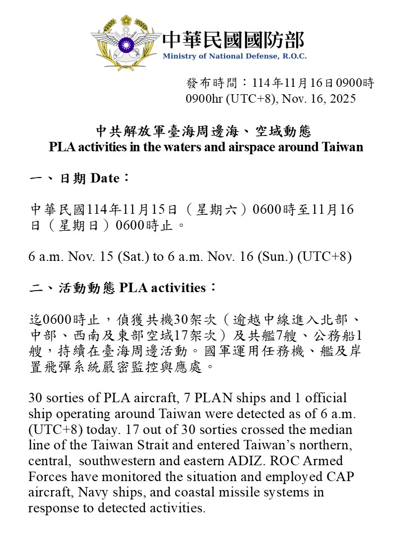30 sorties of PLA aircraft, 7 PLAN ships and 1 official ship operating around Taiwan were detected as of 6 a.m. (UTC+8) today. 17 out of 30 sorties crossed the median line of the Taiwan Strait and entered Taiwan’s northern, central,  southwestern and eastern ADIZ. ROC Armed Forces have monitored the situation and employed CAP aircraft, Navy ships, and coastal missile systems in response to detected activities.