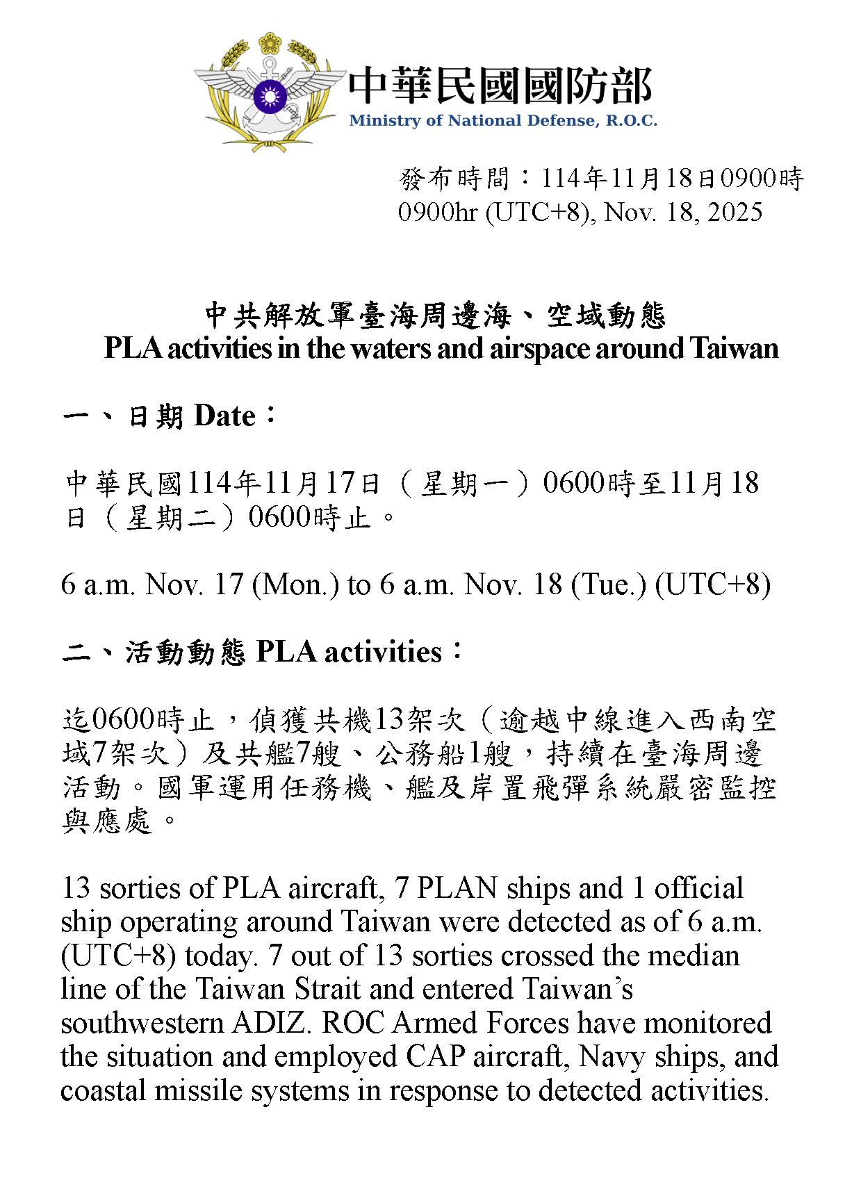 13 sorties of PLA aircraft, 7 PLAN ships and 1 official ship operating around Taiwan were detected as of 6 a.m. (UTC+8) today. 7 out of 13 sorties crossed the median line of the Taiwan Strait and entered Taiwan’s southwestern ADIZ. ROC Armed Forces have monitored the situation and employed CAP aircraft, Navy ships, and coastal missile systems in response to detected activities.