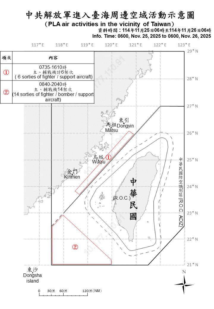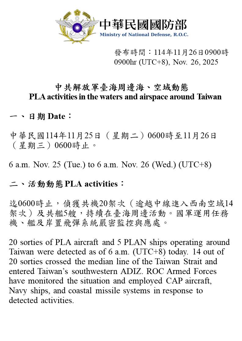 20 sorties of PLA aircraft and 5 PLAN ships operating around Taiwan were detected as of 6 a.m. (UTC+8) today. 14 out of 20 sorties crossed the median line of the Taiwan Strait and entered Taiwan’s southwestern ADIZ. ROC Armed Forces have monitored the situation and employed CAP aircraft, Navy ships, and coastal missile systems in response to detected activities.