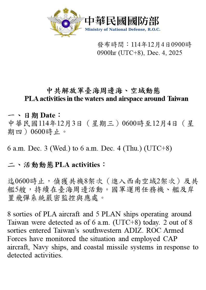 8 sorties of PLA aircraft and 5 PLAN ships operating around Taiwan were detected as of 6 a.m. (UTC+8) today. 2 out of 8 sorties entered Taiwan’s southwestern ADIZ. ROC Armed Forces have monitored the situation and employed CAP aircraft, Navy ships, and coastal missile systems in response to detected activities.