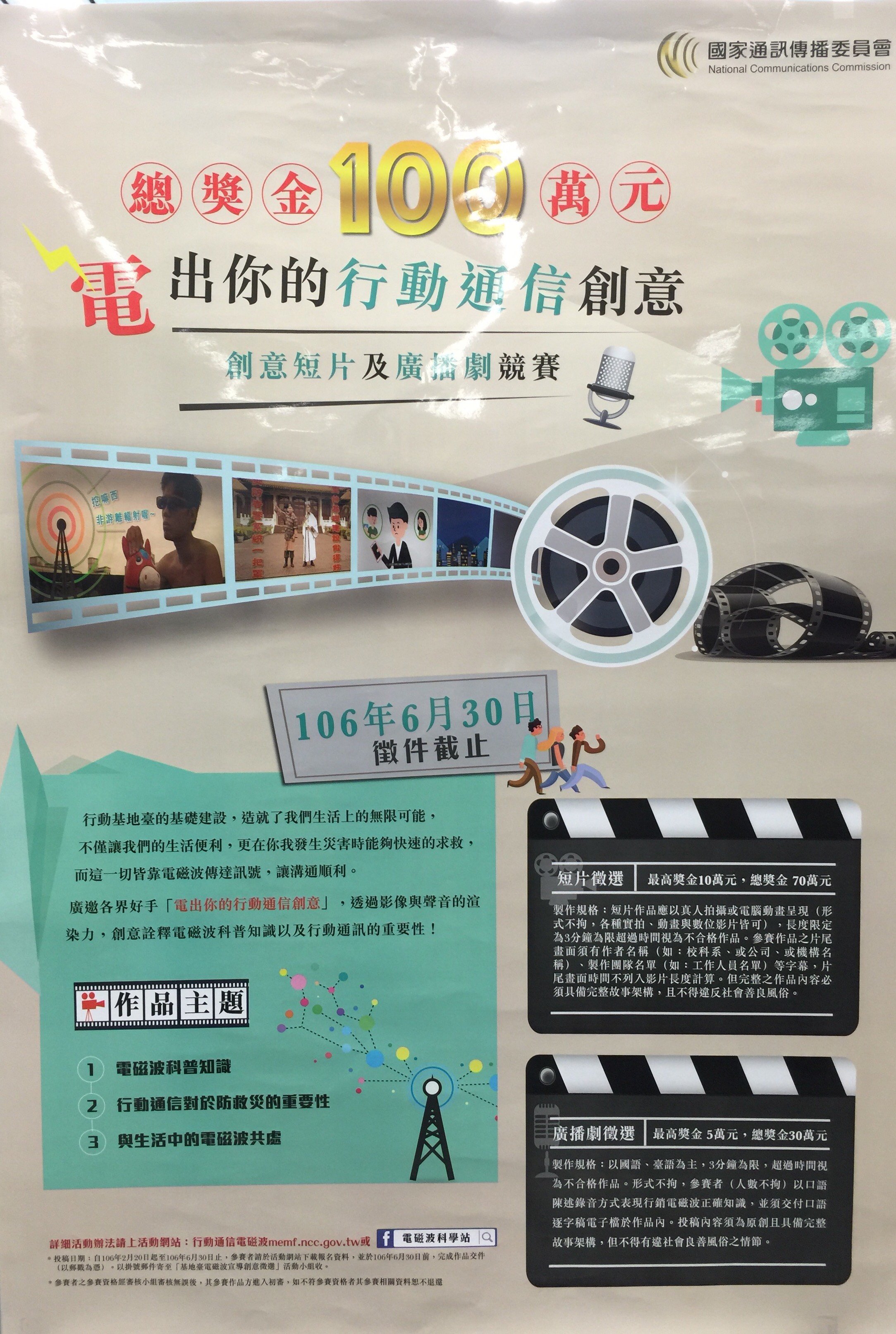 二、投稿日期自106年2月20日至106年6月30日止,本次徵選活動總獎金共計100萬元,詳細活動辦法請逕至行動通信電磁波網站memf.ncc.gov.tw查詢。