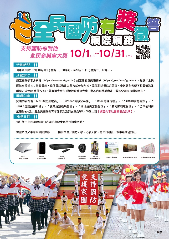 一、活動時間自民國107年10月1日(星期一)08時至10月31日(星期三)17時止,請參加者進入國防部官網(https://www.mnd.gov.tw)、政戰資訊服務網(https://gpwd.mnd.gov.tw)或全民國防教育全球資訊網(https://aode.mnd.gov.tw)點選「全民國防有獎徵答」圖示(Banner),依照電腦動畫遊戲方式指引作答,電腦將隨機篩選題目,答對者可進行下一題,答錯者,該題將重新作答,全數答對者,得在網站上留下個人基本資料與聯繫方式,參加抽獎活動。