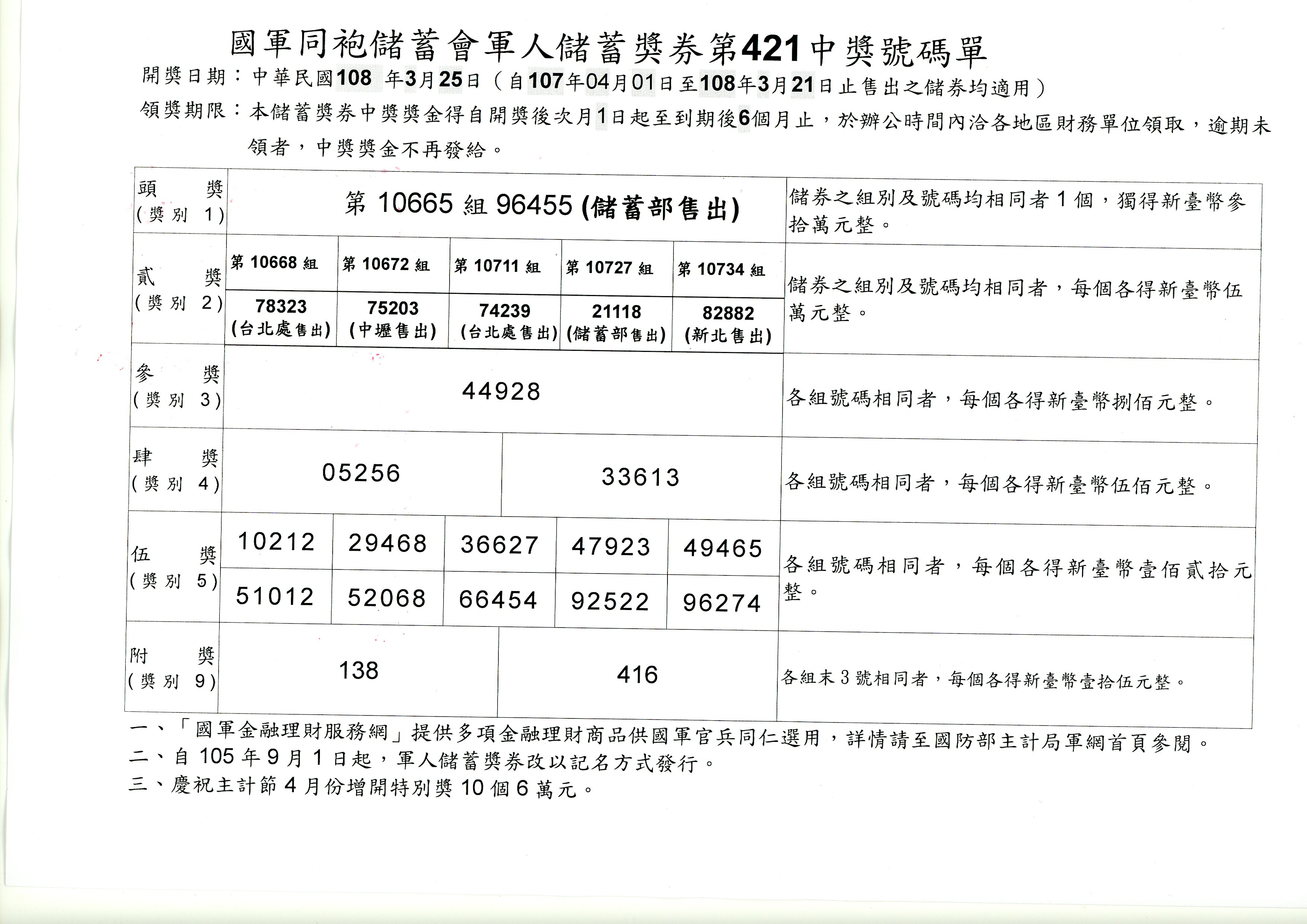 國軍同袍儲蓄會軍人儲蓄獎券第421次中獎號碼