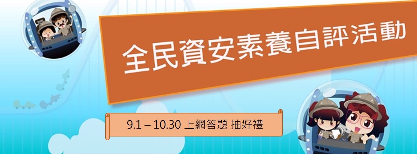 為提升全民資安素養與電腦防護能力,教育部自9月1日至10月30日舉辦「全民資安素養自我評量」活動,敬請鼓勵同仁踴躍上網檢測資訊安全素養認知程度,並有機會參與抽獎。