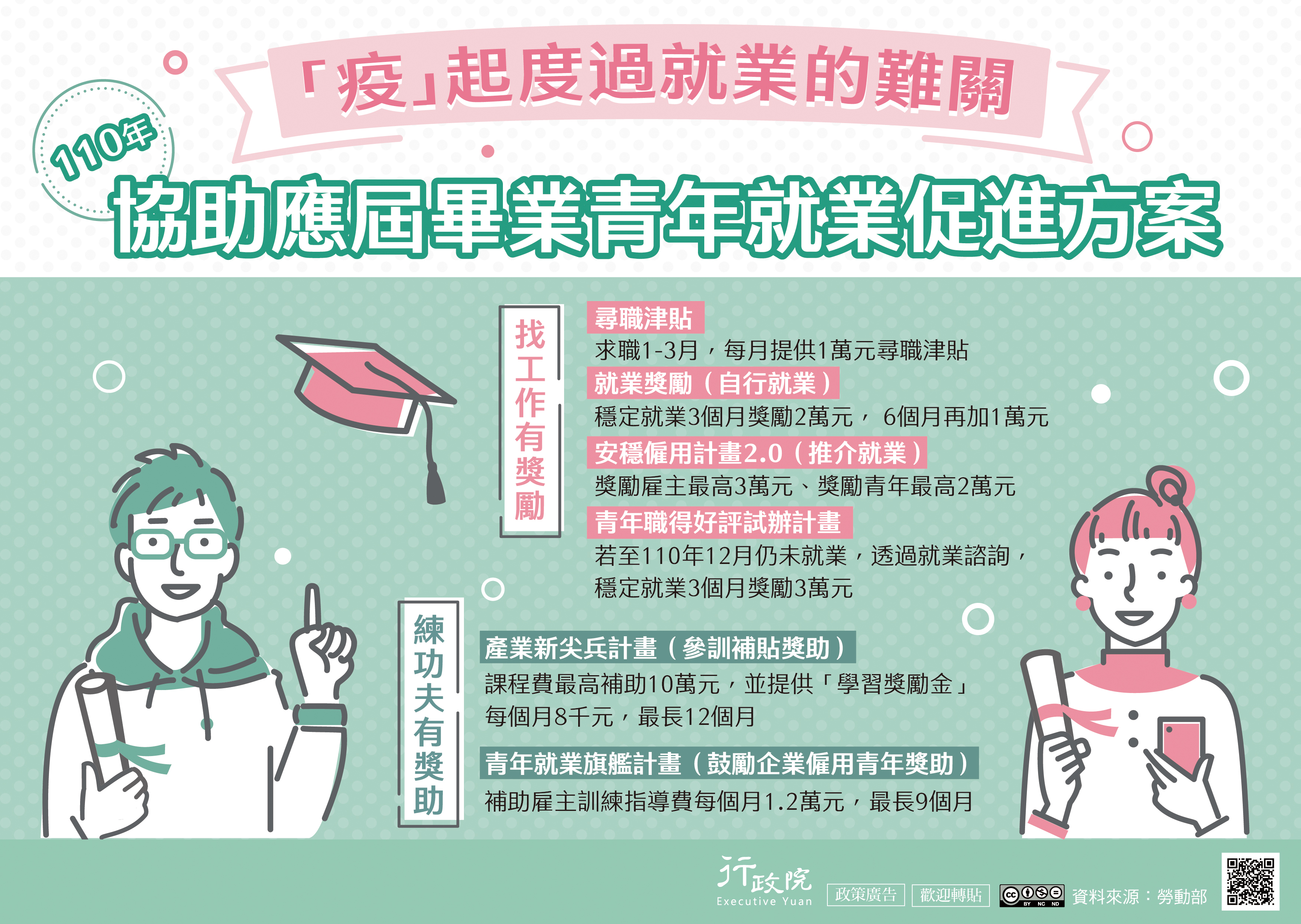 因應疫情衝擊就業市場,政府推動「110年協助應屆畢業青年就業促進方案」,分別以「找工作有獎勵」、「練功夫有獎助」,推動6大尋職與穩定就業措施,並提供創業優惠貸款與減輕學貸負擔,讓更多青年朋友得到妥善照顧及紓緩經濟壓力面對挑戰。行政院特策製旨揭說明資料,電子檔亦可至行政院全球資訊網「政策與計畫─政策櫥窗」項下下載。
