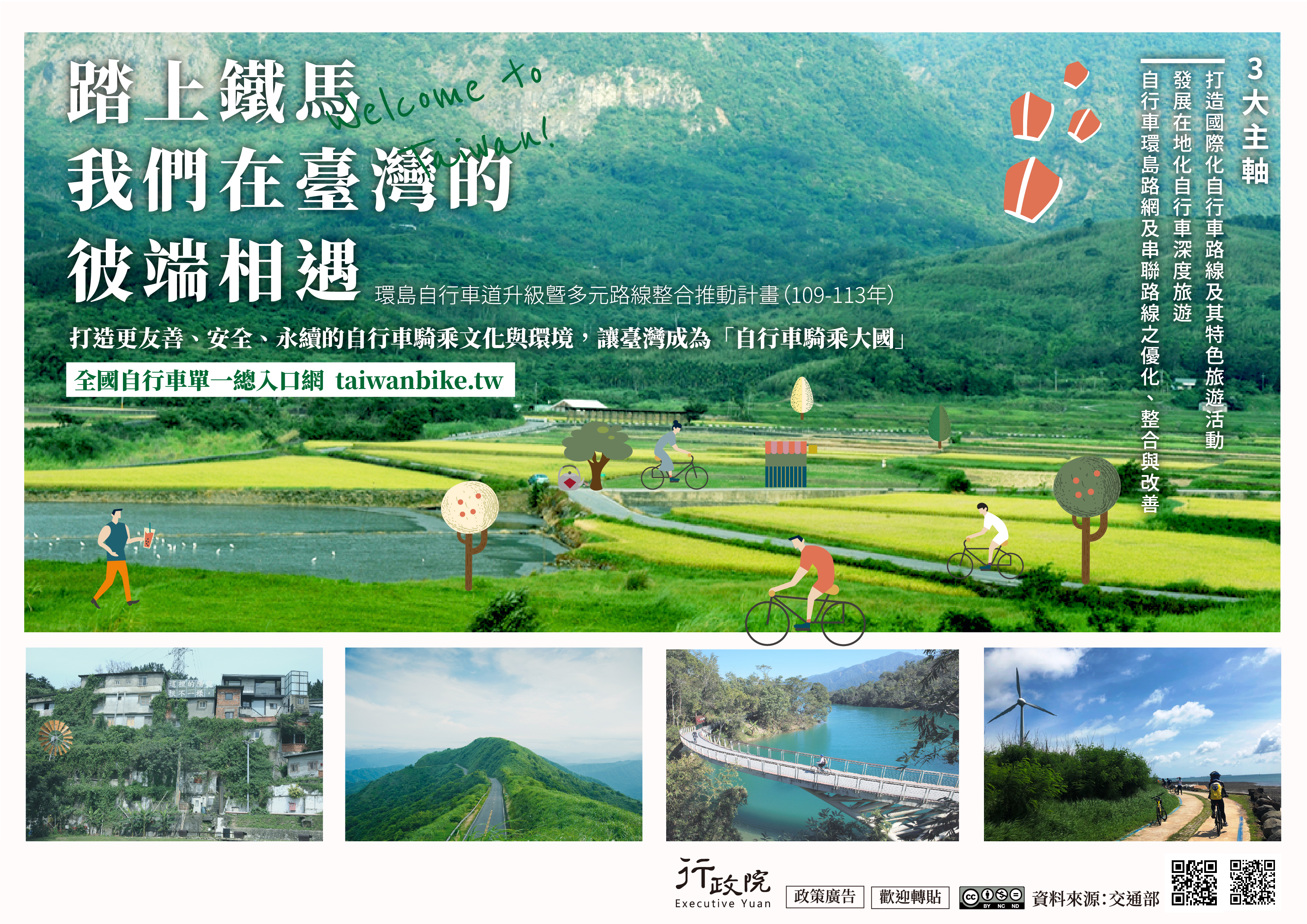 為發展在地化自行車深度旅遊,政府自109年起推動為期4 年的「環島自行車道升級暨多元路線整合計畫(109-112 年)」,今(110)年5月再核定修正該計畫,除提高經費並延長計畫年限至113年,不僅優化環島自行車主幹路網、連結多處斷點,並建置「全國自行車單一總入口網」。行政院特策製旨揭說明資料,電子檔亦可至行政院全球資訊網「政策與計畫─政策櫥窗」項下下載。