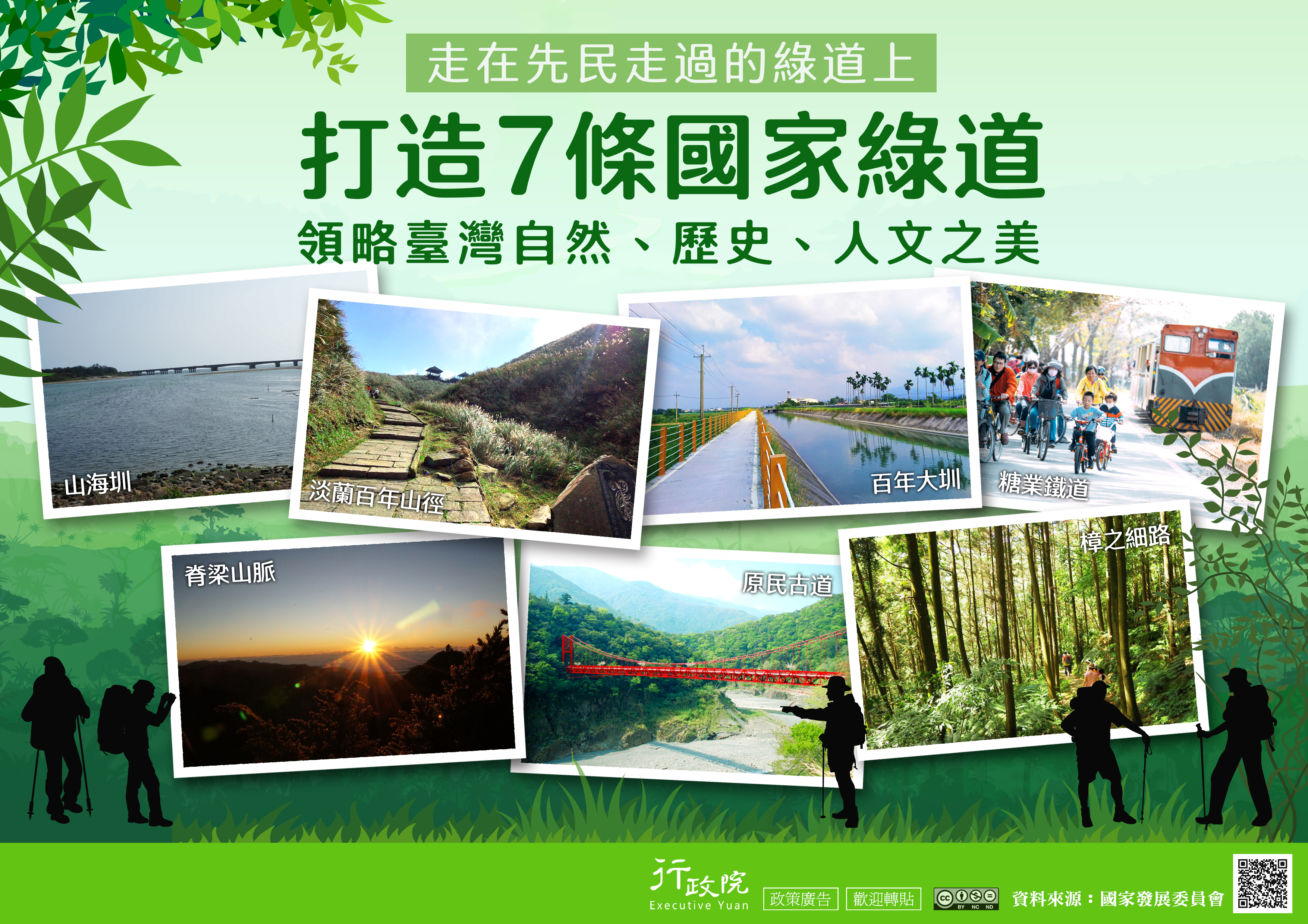 為讓國人享有安全、便利、舒適地親近自然與人文地景的機會,同時更加認識臺灣多元且豐富的族群文化,政府推動7條具有地理風貌與人文歷史的國家綠道,讓民眾走在先民走過的綠道上領略臺灣自然、歷史與人文之美,並藉以吸引國際觀光客前來壯遊臺灣。行政院特策製旨揭說明資料,電子檔亦可至行政院全球資訊網「政策與計畫─政策櫥窗」項下下載。