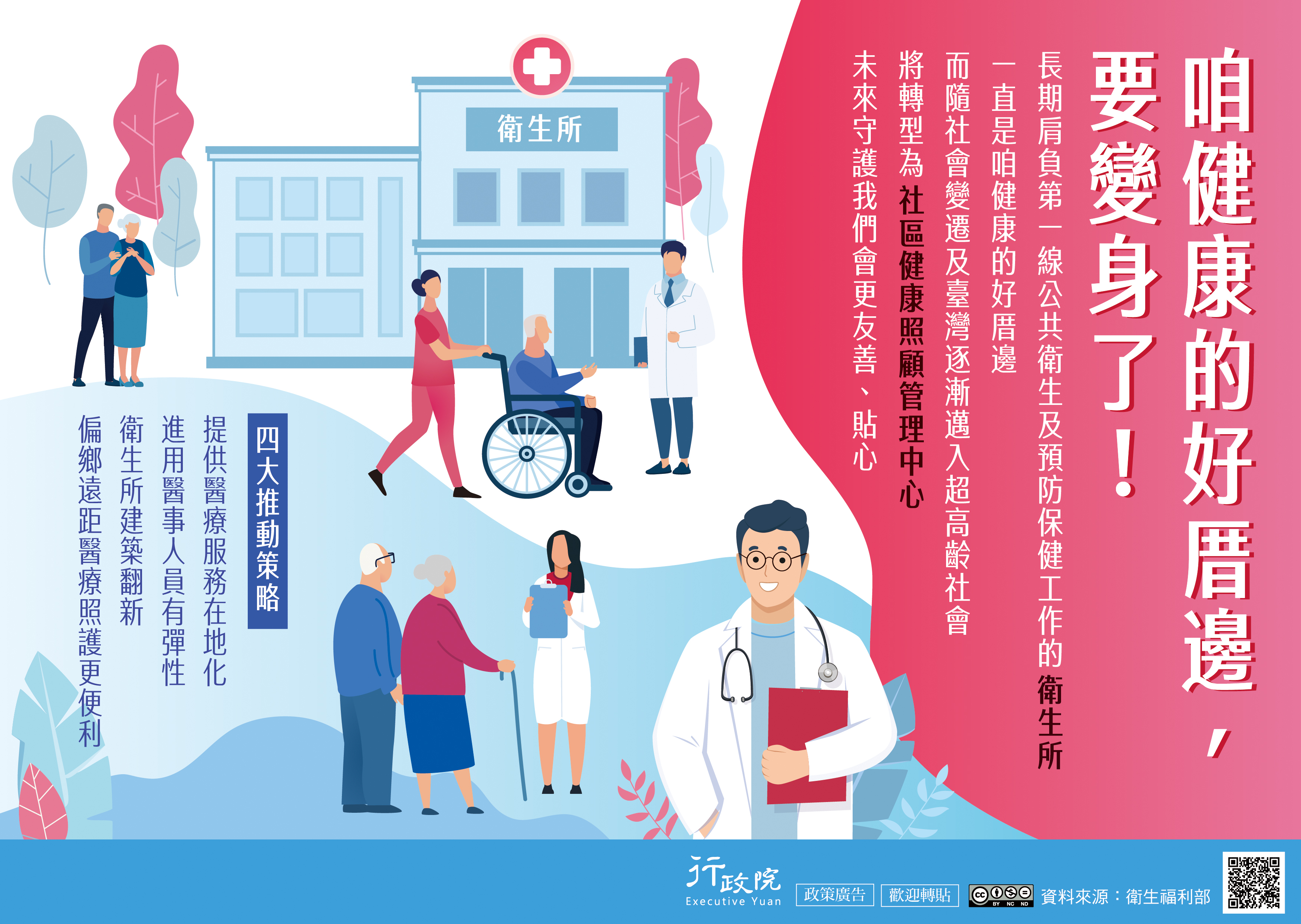 基層衛生所長期負責第一線公共衛生與預防保健工作,隨著臺灣逐漸邁入超高齡社會,政府推動「公共衛生服務體系升級」政策,讓衛生所轉型為社區健康照顧管理中心,以打造在地化社區健康照護服務,進而成為守護民眾貼心的好厝邊。行政院特策製旨揭說明資料,電子檔亦可至行政院全球資訊網「政策與計畫─政策櫥窗」項下下載。