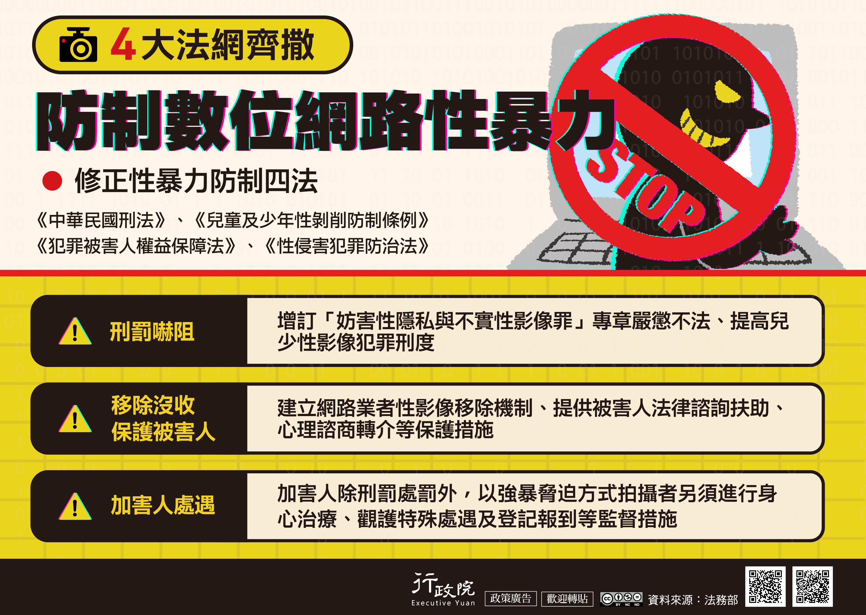 為防制網路、數位性別暴力,政府推動修正《中華民國刑法》、《犯罪被害人權益保障法》、《性侵害犯罪防治法》與《兒童及少年性剝削防制條例》等性暴力防制4法, 透過刑罰嚇阻、移除沒收、保護被害人、加害人處遇等措施,架構更完善的性別暴力防護網絡,期有效防制性暴力 犯罪。行政院特策製旨揭說明資料,電子檔亦可至行政院全球資訊網「政策與計畫─政策櫥窗」下載。