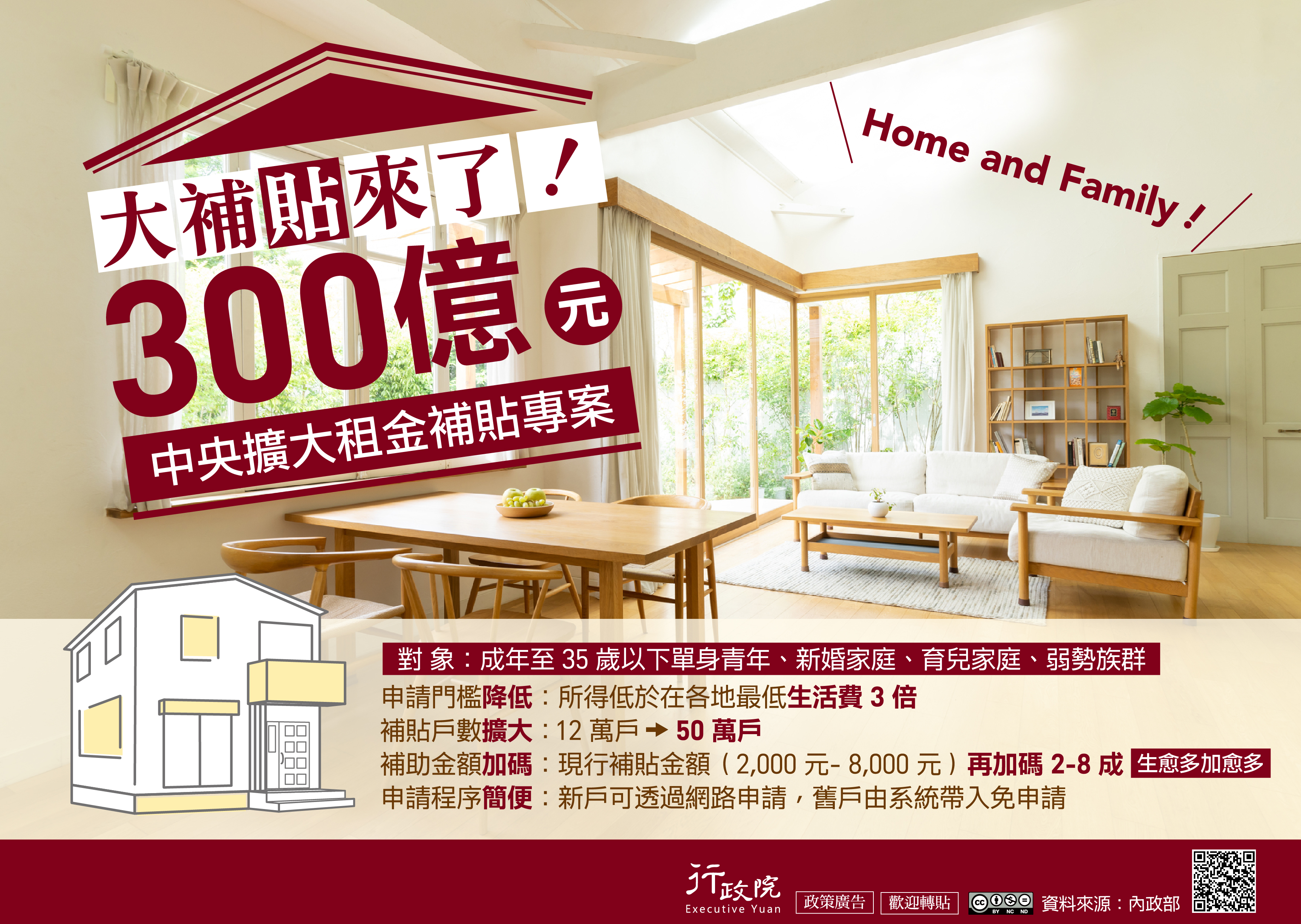 為減輕租屋家庭經濟負擔,政府推出「中央擴大租金補貼專案」,透過申請門檻降低、補貼戶數擴大、補助金額加碼,申請程序簡便等措施,提供單身青年、年輕家庭、弱勢族群租屋補貼,期營造安心成家的環境及達到維護居住正義的目標。行政院特策製旨揭說明資料,電子檔亦可至行政院全球資訊網「政策與計畫─政策櫥窗」下載。