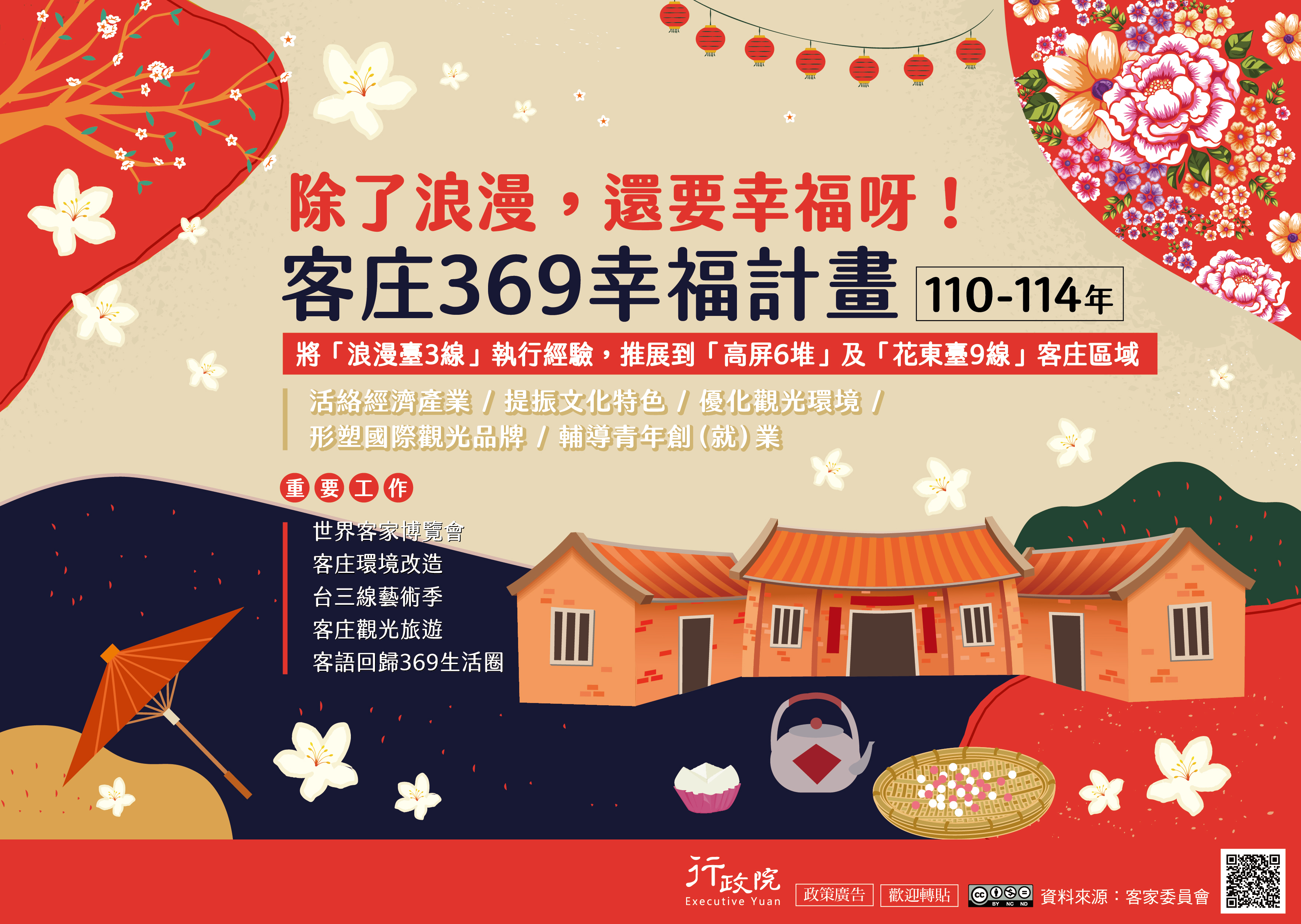 一、為持續提振客家文化特色產業,政府推動「客庄369幸福計畫」,將「浪漫臺3線」執行經驗,擴展到「高屏6堆」及「花東臺9線」客庄區域,共同打造客庄369豐富的人文、生態及產業,啟動客家文藝復興,並帶動青壯人才回流或移居。行政院特策製旨揭說明資料,電子檔亦可至行政院全球資訊網「政策與計畫─政策櫥窗」下載。