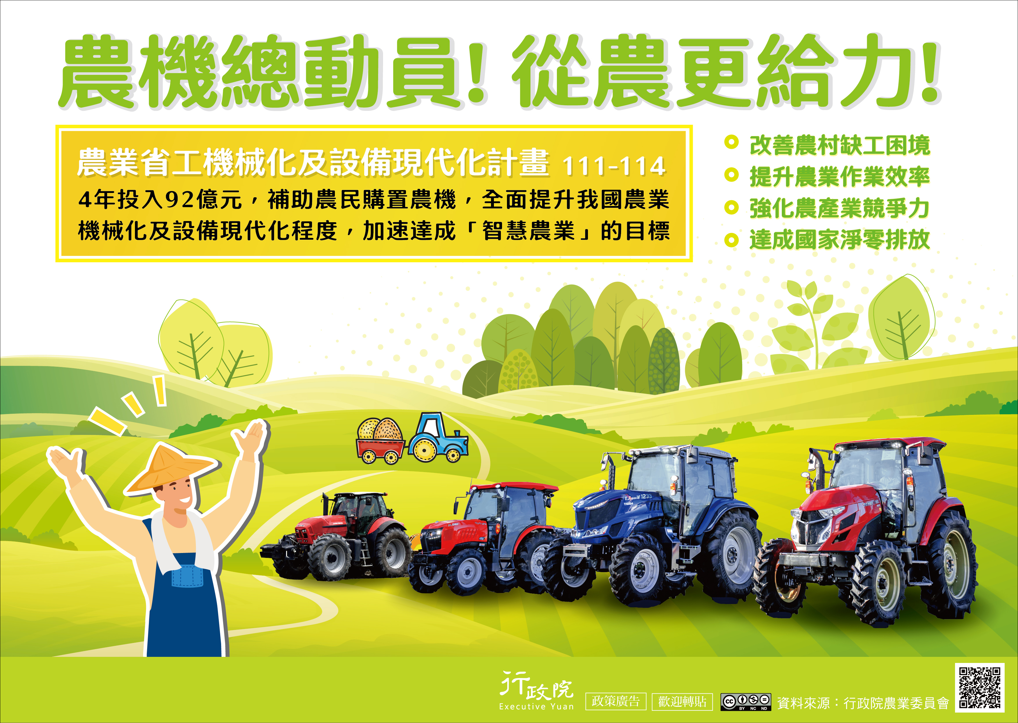 一、為改善我國農村勞動力不足的問題,政府近年來推動農機補助政策,於111至114年再投入92億元經費,推動「農業省工機械化及設備現代化方案」,就農林漁畜各產業全面推動自動化、機械化,以提升農業作業效率,強化農產業競爭力,並協助達成國家淨零排放願景。行政院特策製旨揭說明資料,電子檔亦可至行政院全球資訊網「政策與計畫─政策櫥窗」下載。