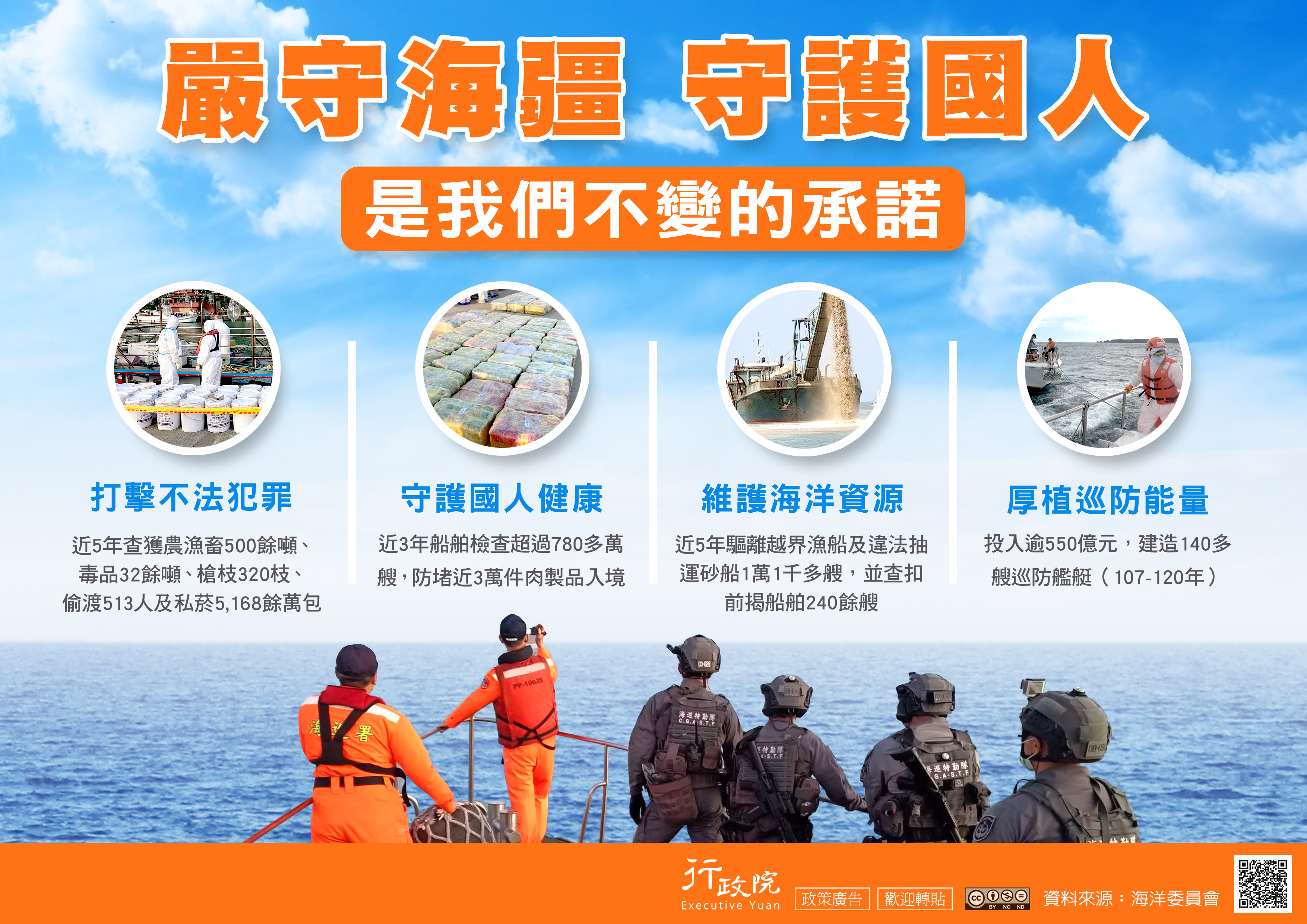 一、為嚴守海疆,執法有力,政府近年來大幅增加海巡人力及不斷厚植艦艇能量,未來將從勤務超前部署、擴大溯源查處、善用科技輔助、強化跨境合作及邊境防疫等方面精進,全力提升及維護我海域治安,守護國家安全與國民健康。行政院特策製旨揭說明資料,電子檔亦可至行政院全球資訊網「政策與計畫─政策櫥窗」項下下載。