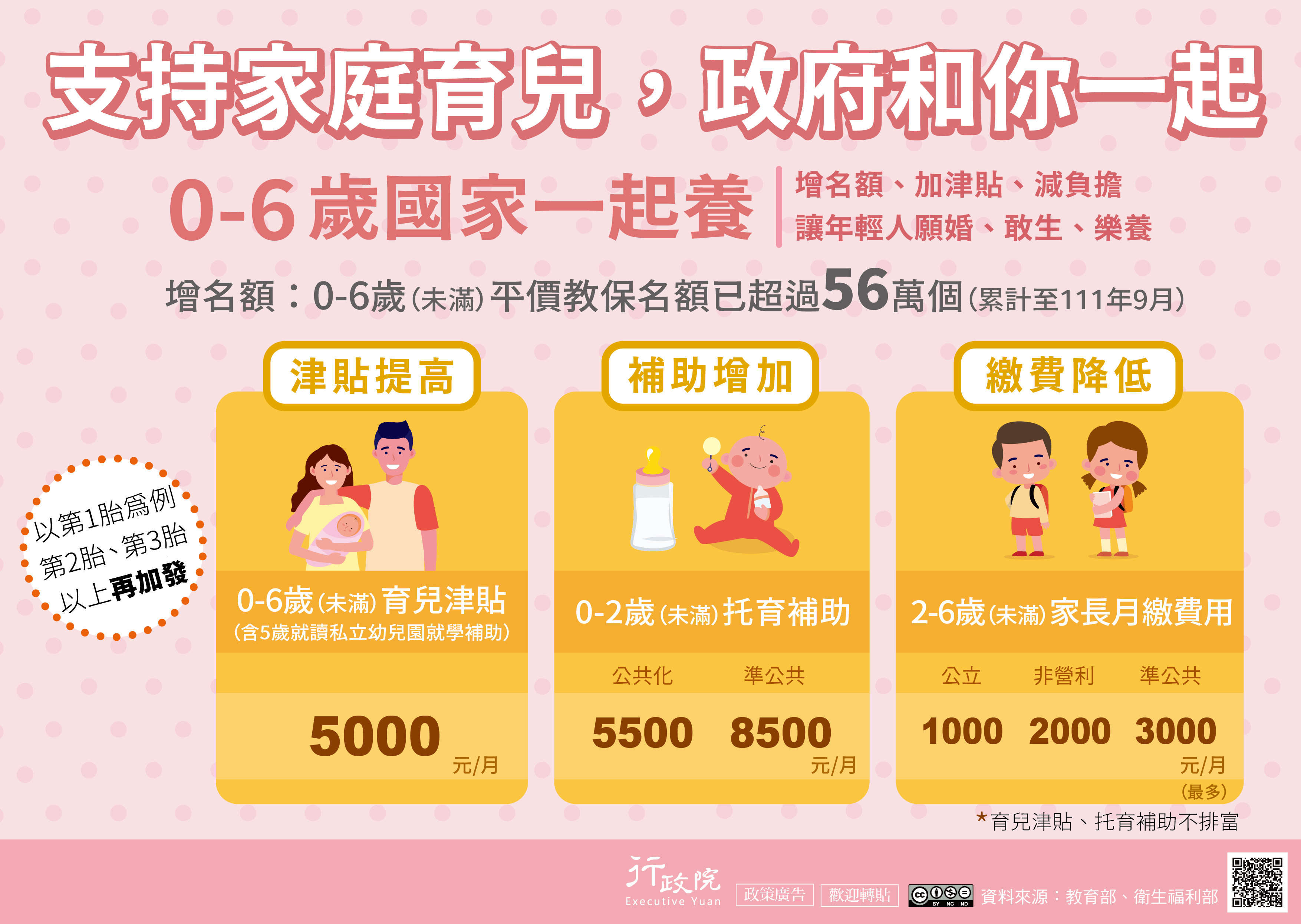 一、為提供養兒育女家庭最大的奧援,讓年輕人敢婚、願生、樂養,政府於明(112)年起擴大推動以增名額、加津貼、減負擔為主軸的「0-6歲國家一起養」政策(2021-2024),期以傾全國之力協助培養國家未來的棟梁。行政院特策製旨揭說明資料,電子檔亦可至行政院全球資訊網「政策與計畫─政策櫥窗」項下下載。