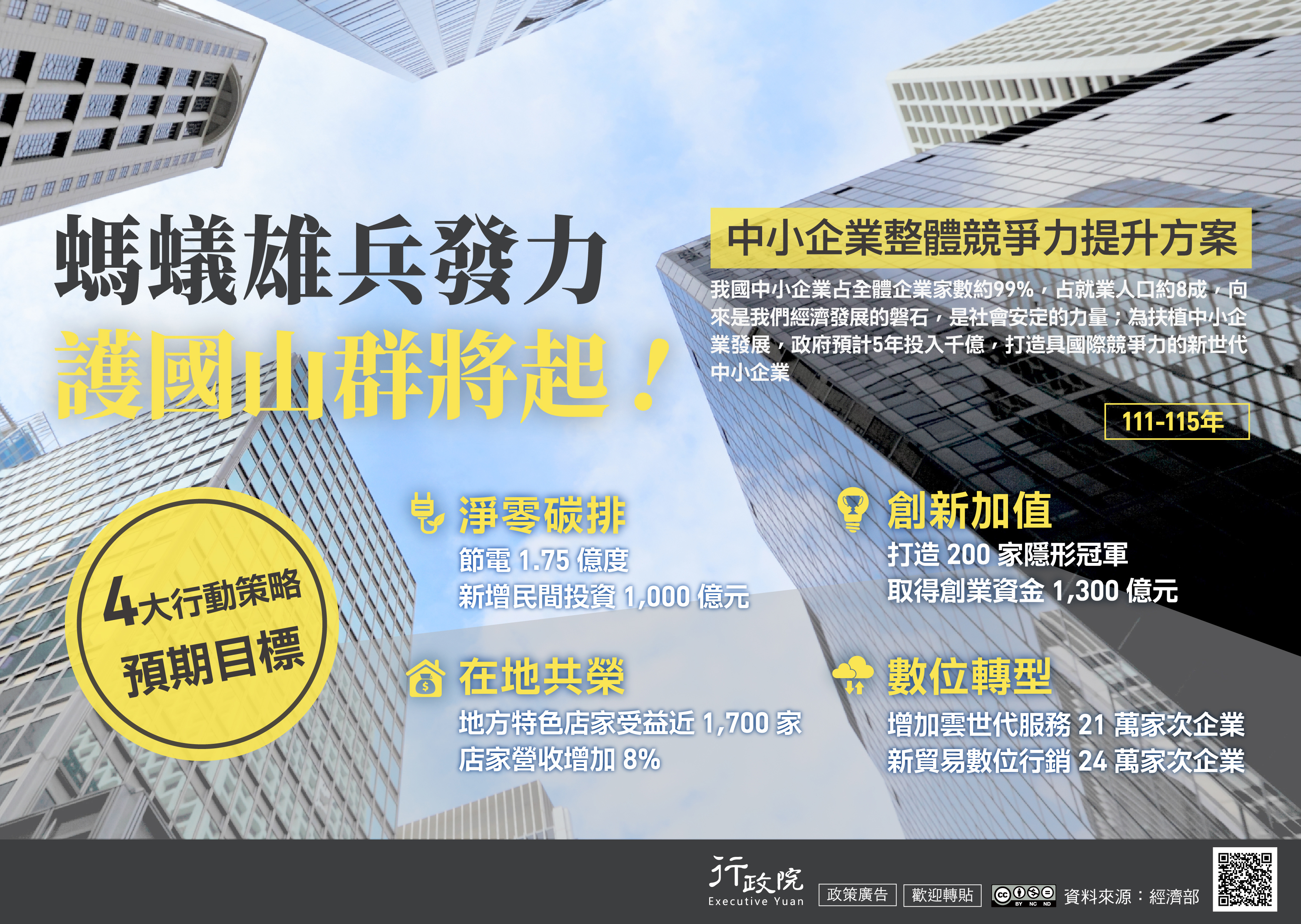 一、中小企業為我國經濟發展磐石,為打造具國際競爭力的新世代中小企業,政府推動「中小企業整體競爭力提升方案」,透過淨零碳排、創新加值、在地共榮、數位轉型等四大行動策略,加強經營韌性,並接軌國際淨零碳排之轉型新契機。行政院特策製旨揭說明資料,電子檔亦可至行政院全球資訊網「政策與計畫─政策櫥窗」項下下載。
