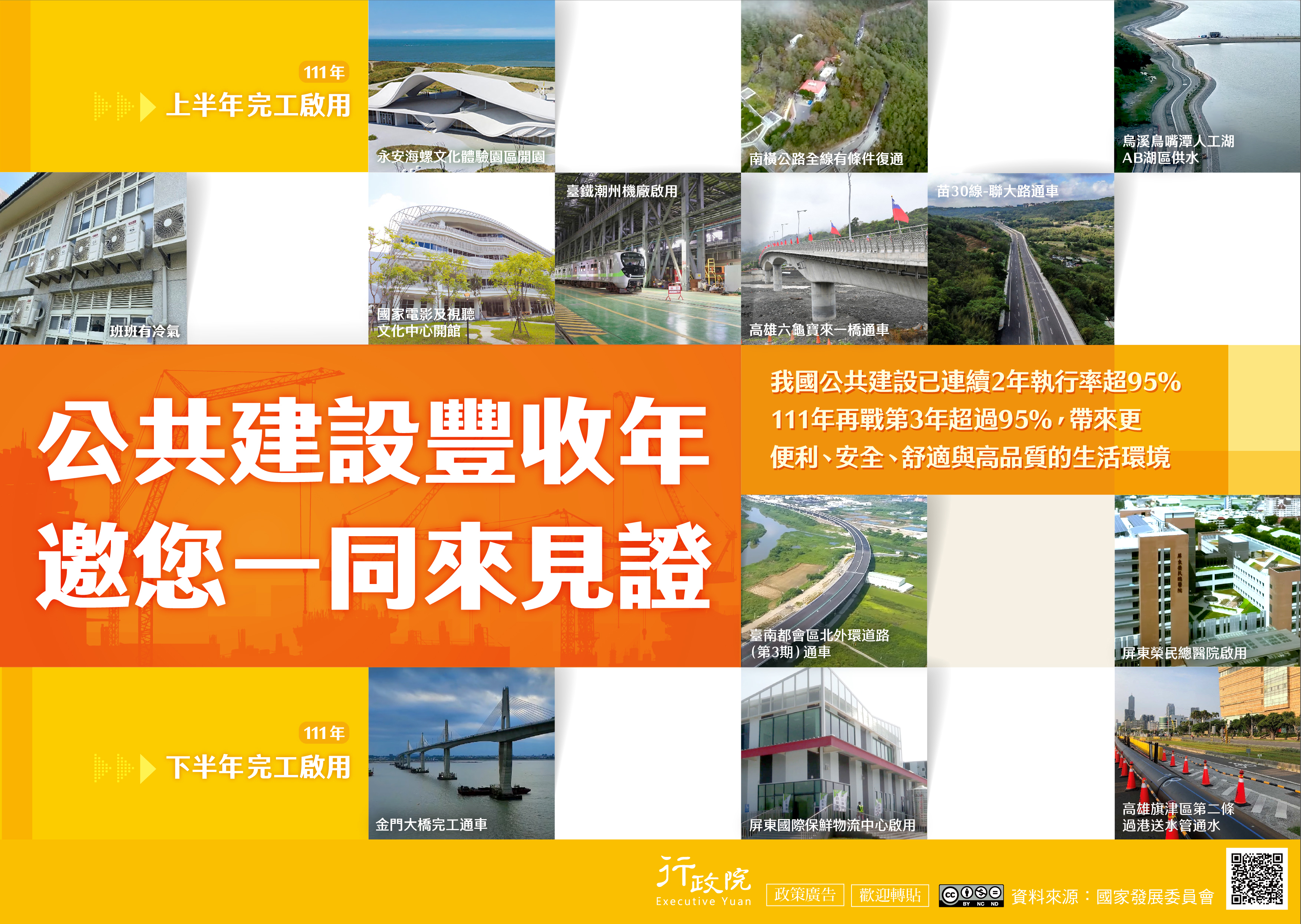 一、我國公共建設已連續2年執行率超過95%,111年可望達成連續3年均超過95%的目標,為國人帶來更便利、安全、舒適與高品質的生活環境,並帶動內需與推升經濟發展。行政院特策製旨揭說明資料,電子檔亦可至行政院全球資訊網「政策與計畫─政策櫥窗」下載。
