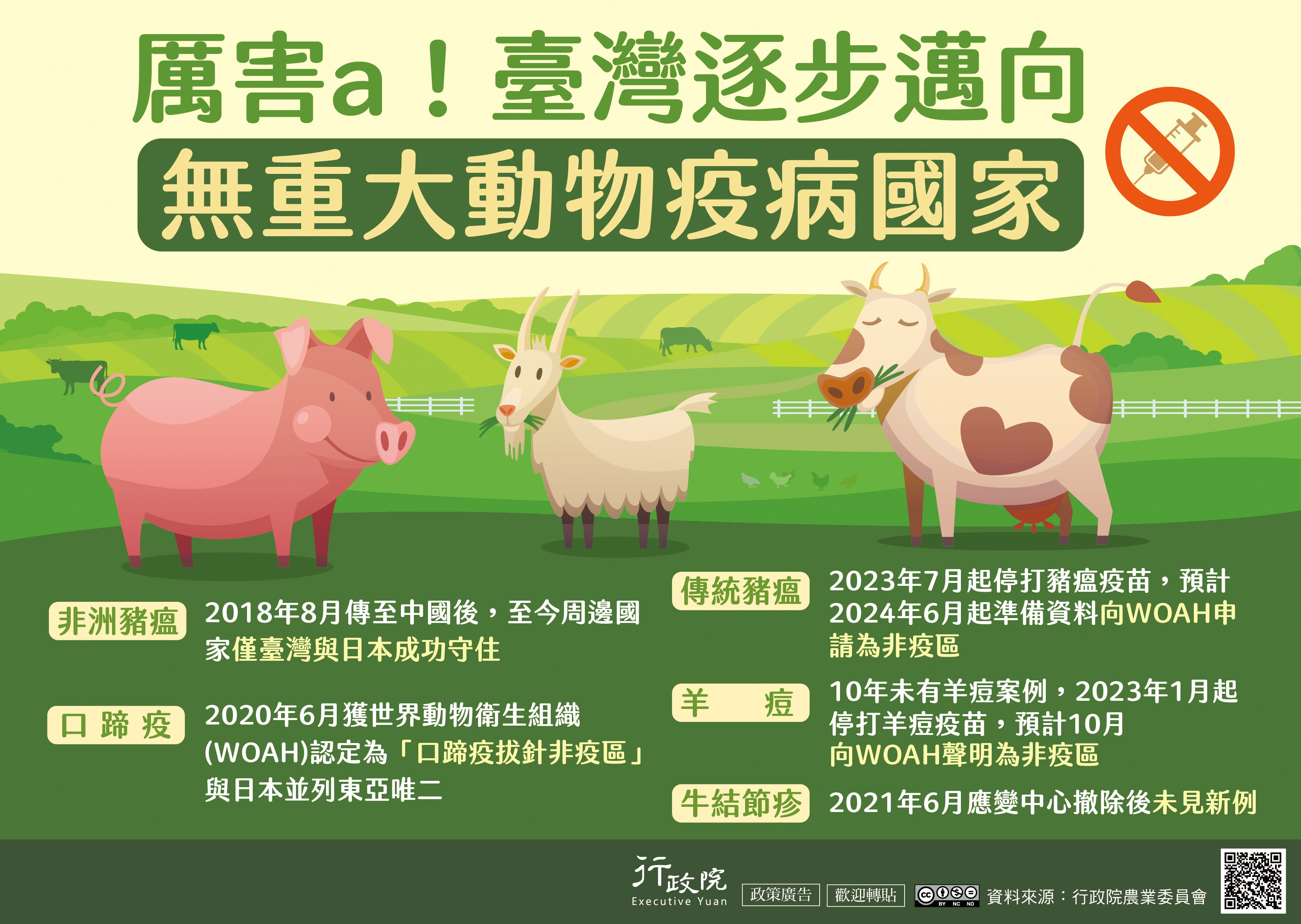 一、近年我國在動物疫病防疫有成,成功守住非洲豬瘟和撲滅口蹄疫疫情,預計明(2024)年向「世界動物衛生組織」(WOAH)申請「豬瘟非疫區」,逐步邁向無重大動物疫病國家。行政院特策製旨揭說明資料,請協助推廣運用,電子檔請至本院全球資訊網「政策與計畫─政策櫥窗」項下下載。