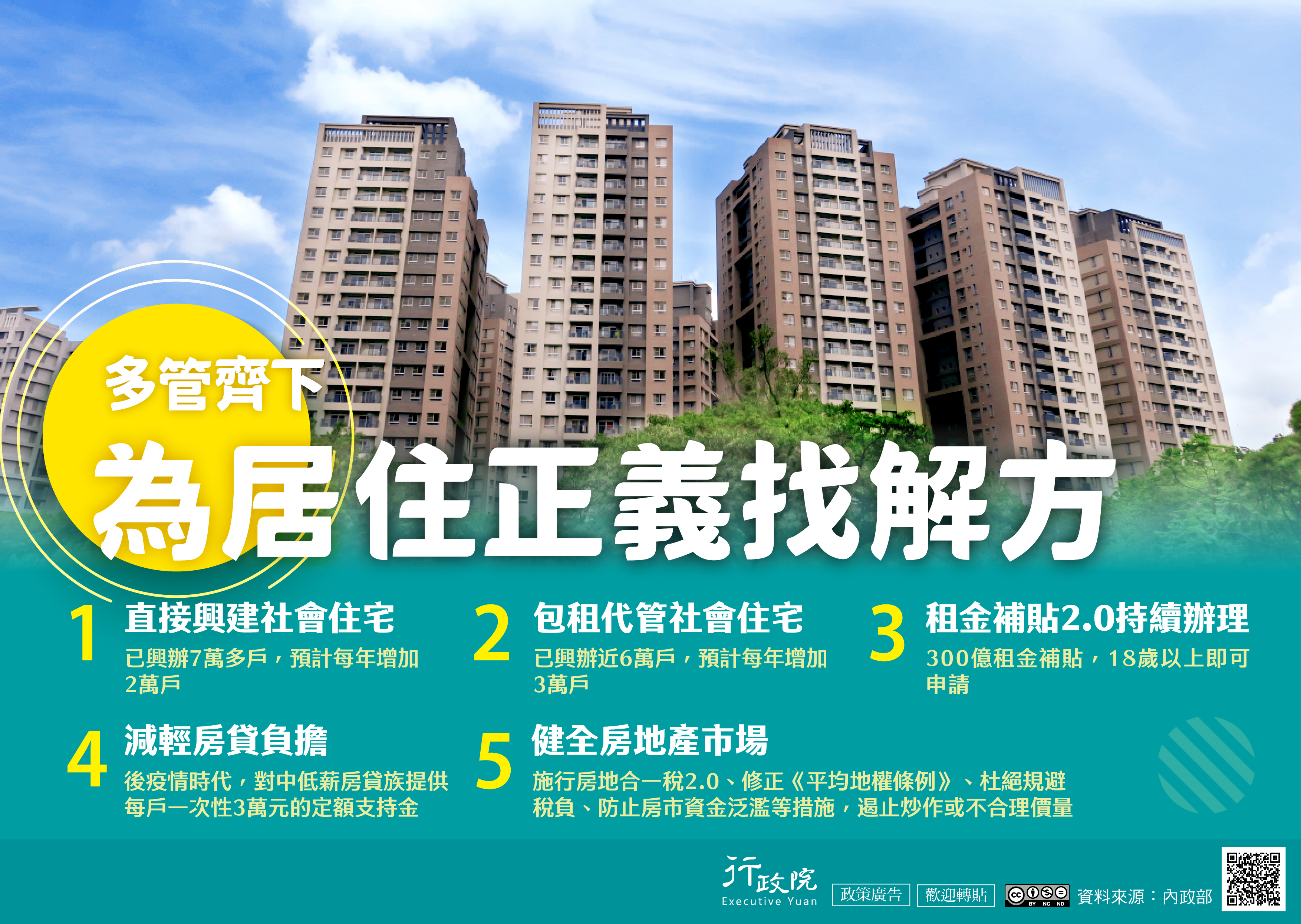 一、為落實居住正義,政府持續透過推動社會住宅政策、健全房市措施、租金補貼等多重方案,穩定住宅市場,減輕民眾居住負擔。行政院特策製旨揭說明資料,請協助推廣運用,電子檔請至本院全球資訊網「政策與計畫─政策櫥窗」項下下載。